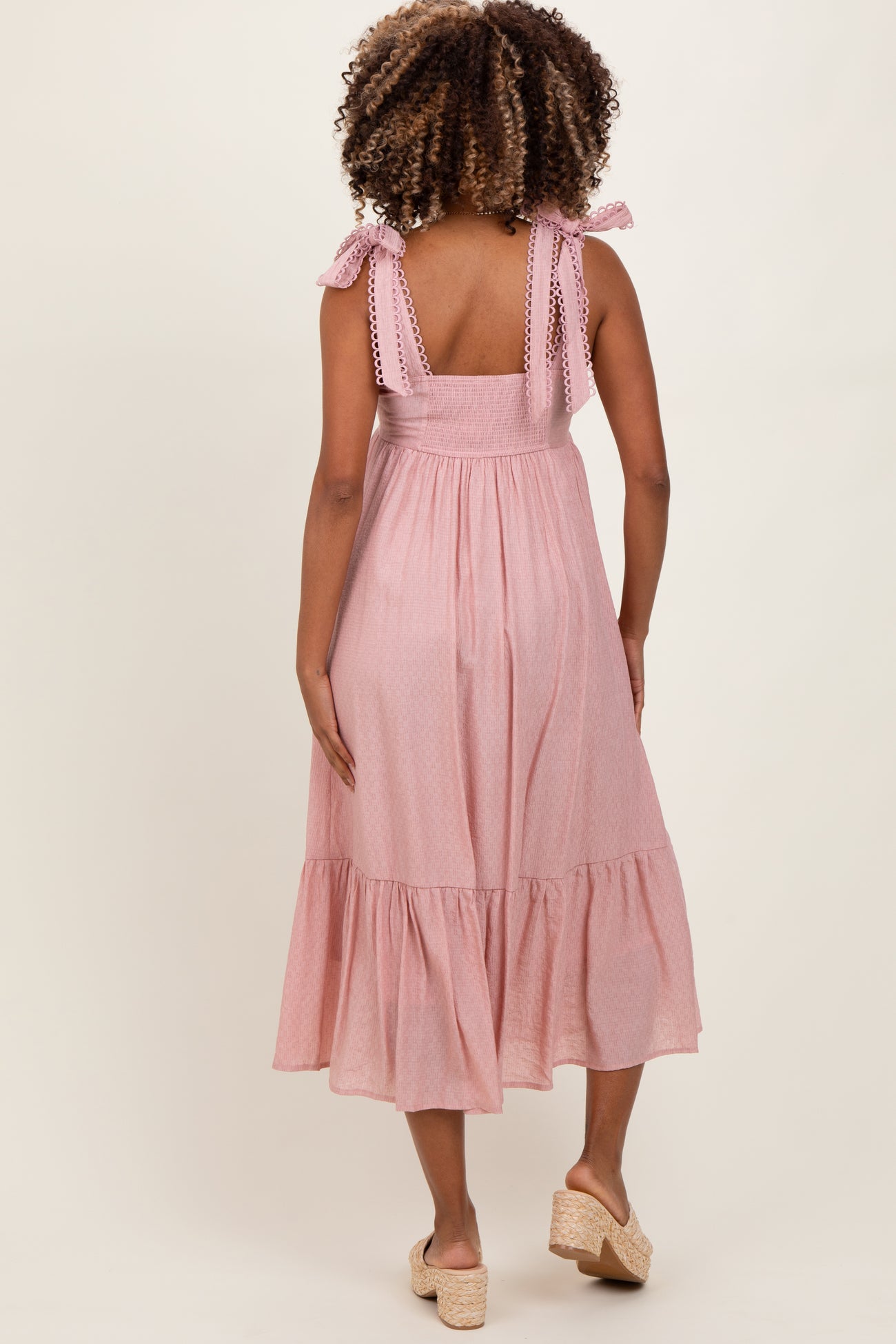 Light Pink Scallop Trim Shoulder Tie Maternity Midi Dress