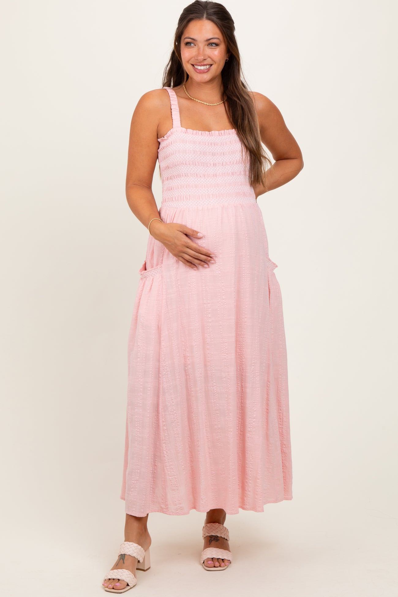 Light Pink Smocked Embroidered Bust Textured Maternity Midi Dress