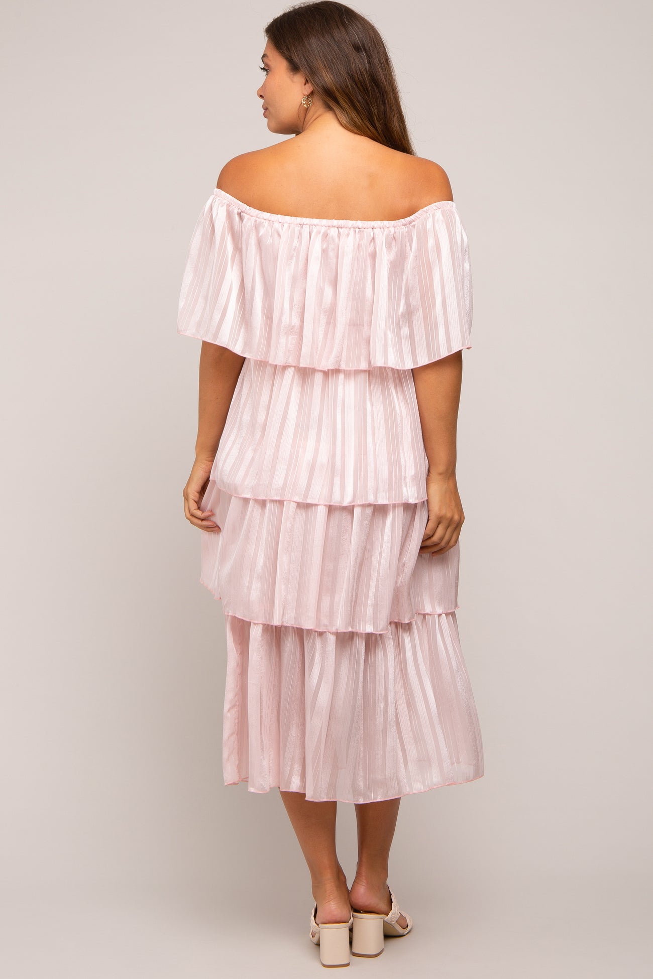 A striped maternity midi dress featuring an off the shoulder neckline, a flounce top, and a layered body.