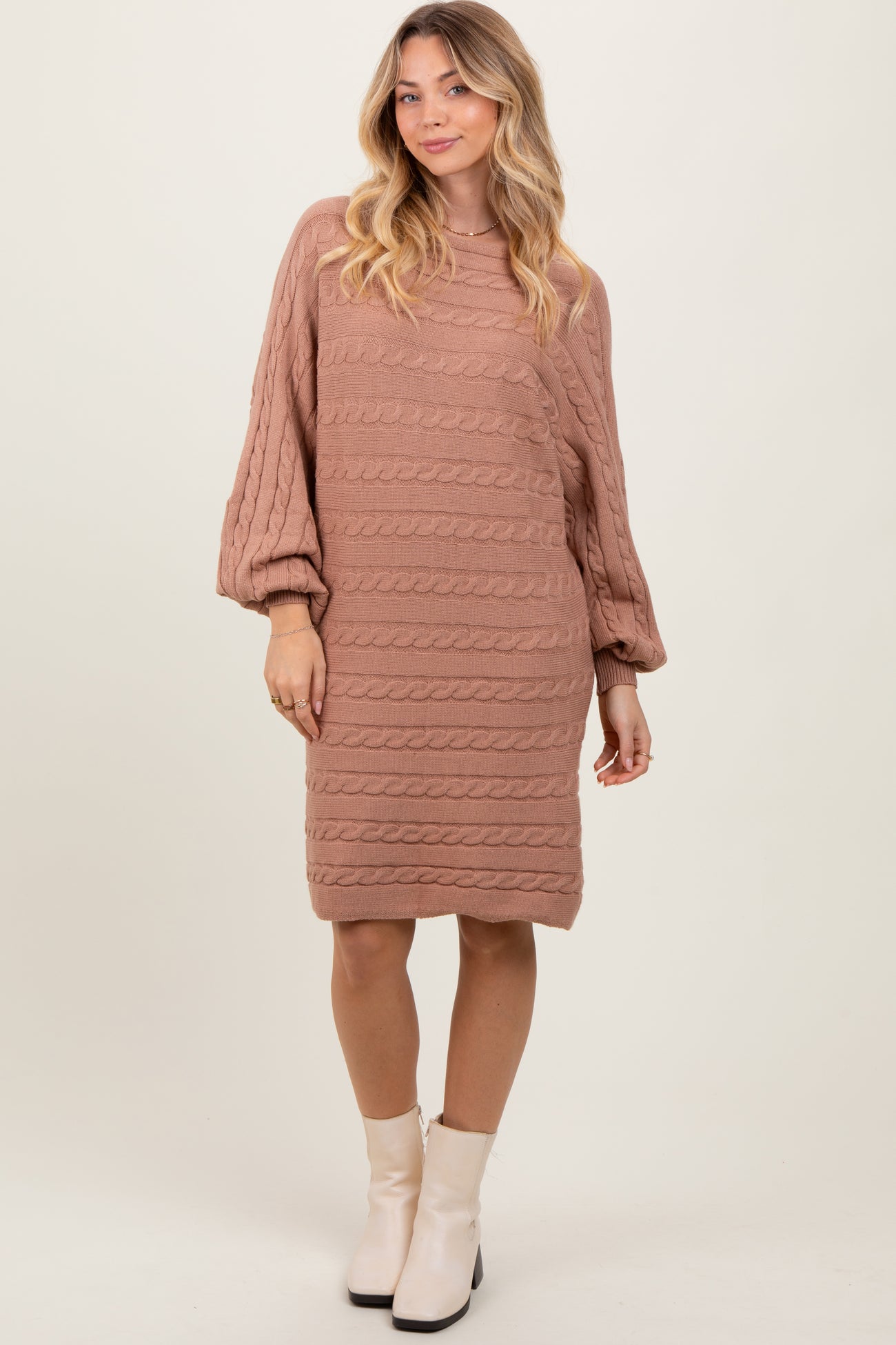 Light Taupe Cable Knit Dolman Sleeve Sweater Mini Dress