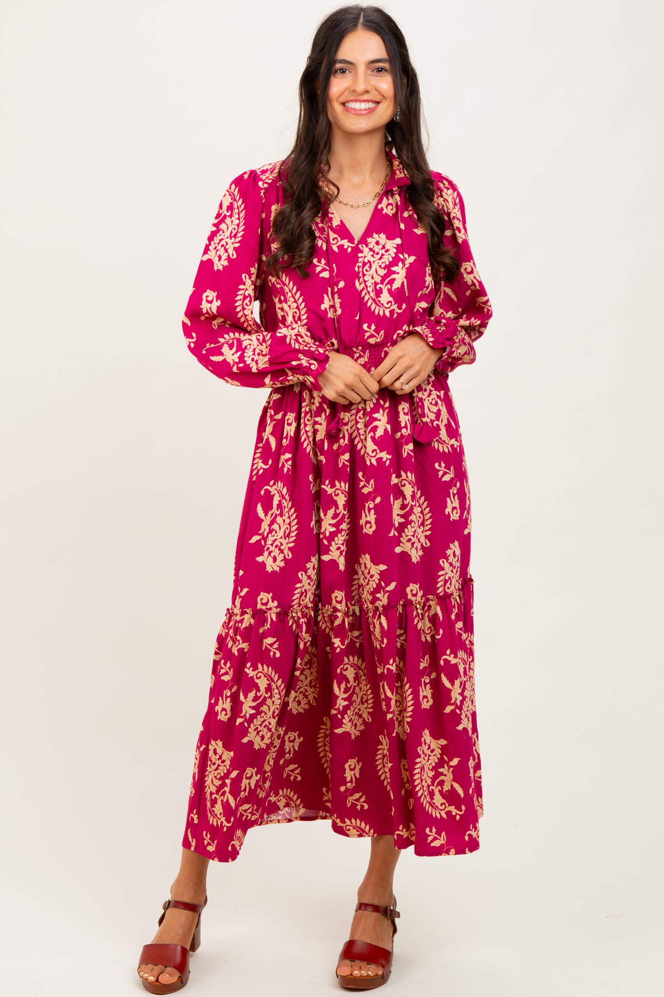 Magenta Damask Front Tie Smocked Waist Maternity Midi Dress