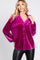 A velvet blouse featuring a button down front, long sleeves, a front pocket and a collared v-neckline.