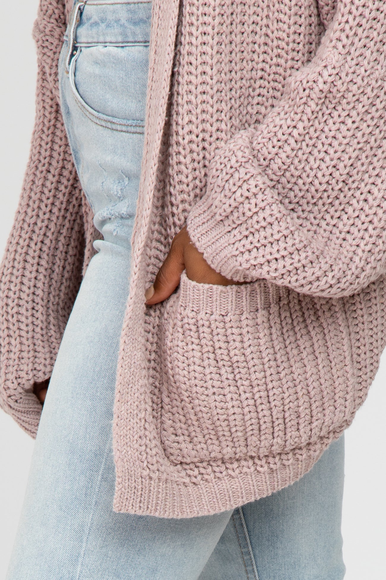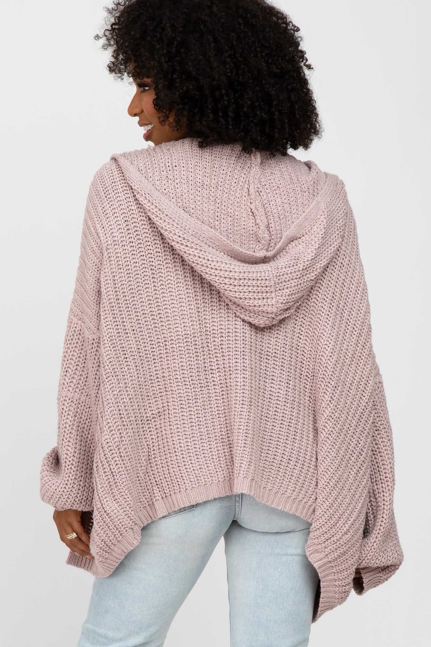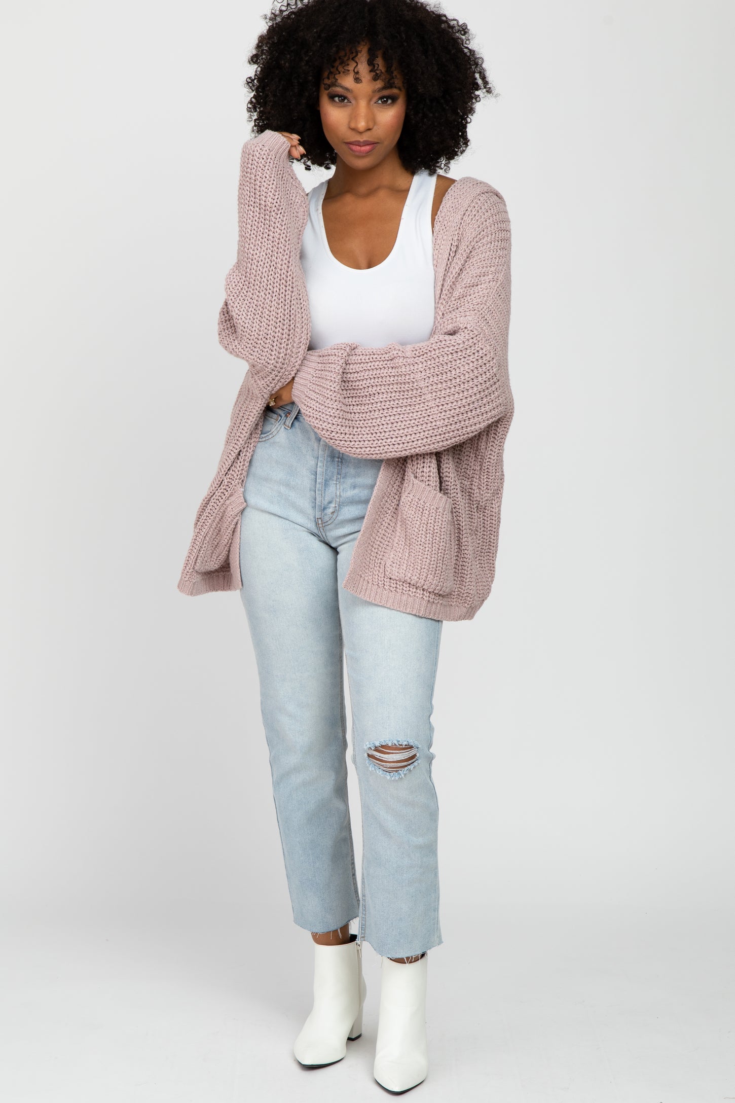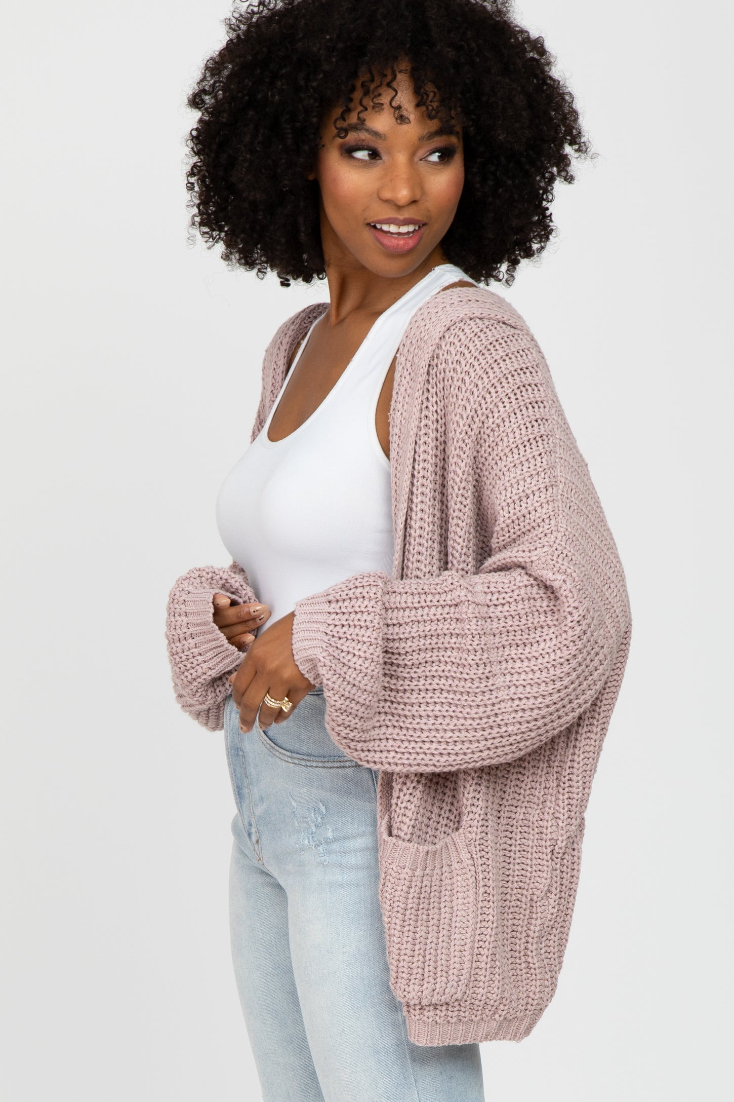 A cable knit cardigan with long dolman sleeves, a hoodie, and font pockets.