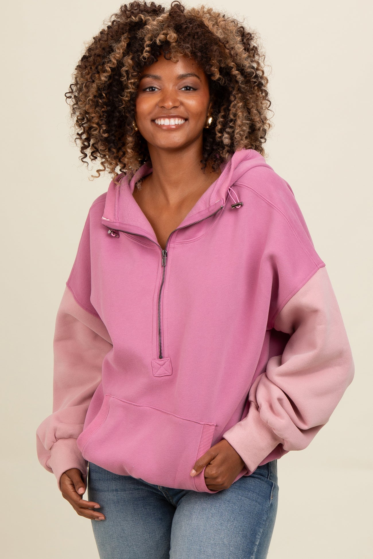 Step into cozy style with our Mauve Colorblock Half Zip Hoodie. Featuring a flattering relaxed fit and an on-trend colorblock design in soft mauve shades, this hoodie is perfect for layering or lounging. The half zip detail allows for adjustable coverage and added flair, while the ribbed cuffs and kangaroo pocket keep you comfortable and warm. Made from a soft, breathable fabric blend, it offers all-day comfort with a modern twist. Pair it with your favorite jeans or leggings for effortless casual wear. Elevate your wardrobe with this must-have everyday essential!