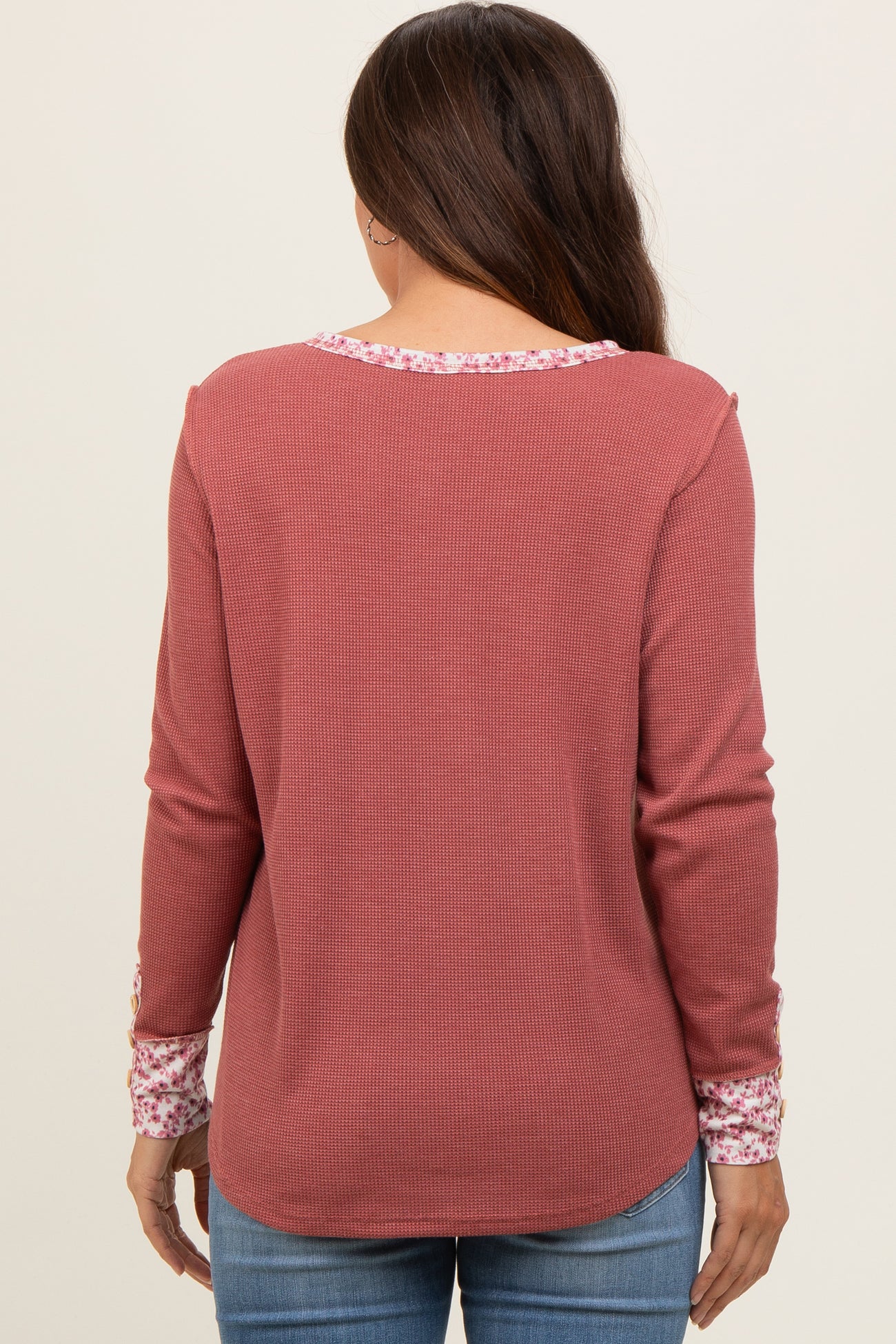 A waffle knit maternity top featuring a henley neckline, top accent buttons, and long sleeves with button accents. Also includes floral trim along the neckline and sleeve cuffs.