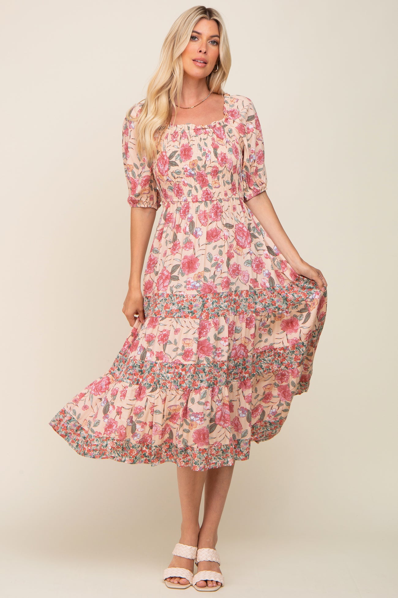 A floral midi dress featuring a squared ruffle accent neckline, short puff sleeves, a smocked top, and a tiered skirt.