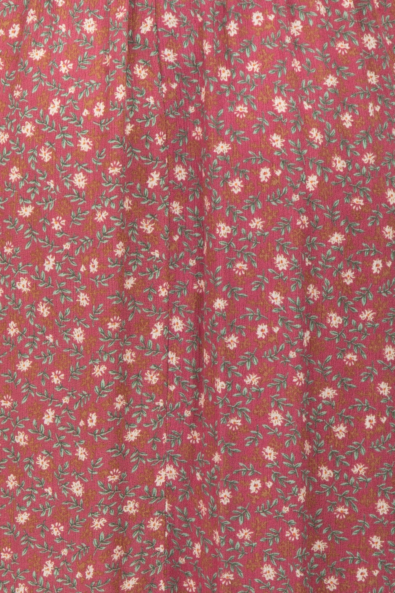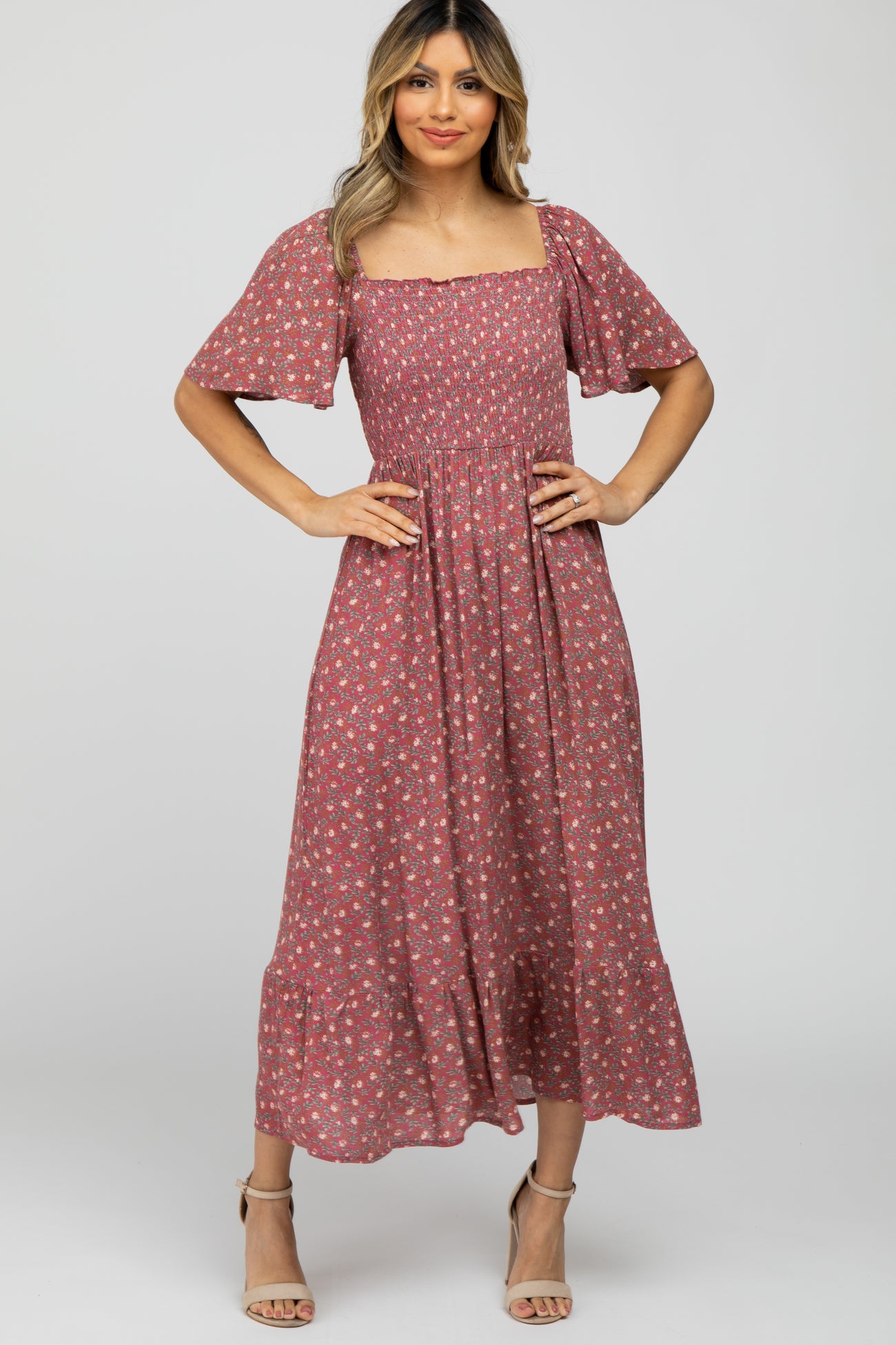 Details A floral printed midi dress featuring a square neckline, short flutter sleeves, a smocked elastic top, an empire waist and a ruffle hem. Content + Care
