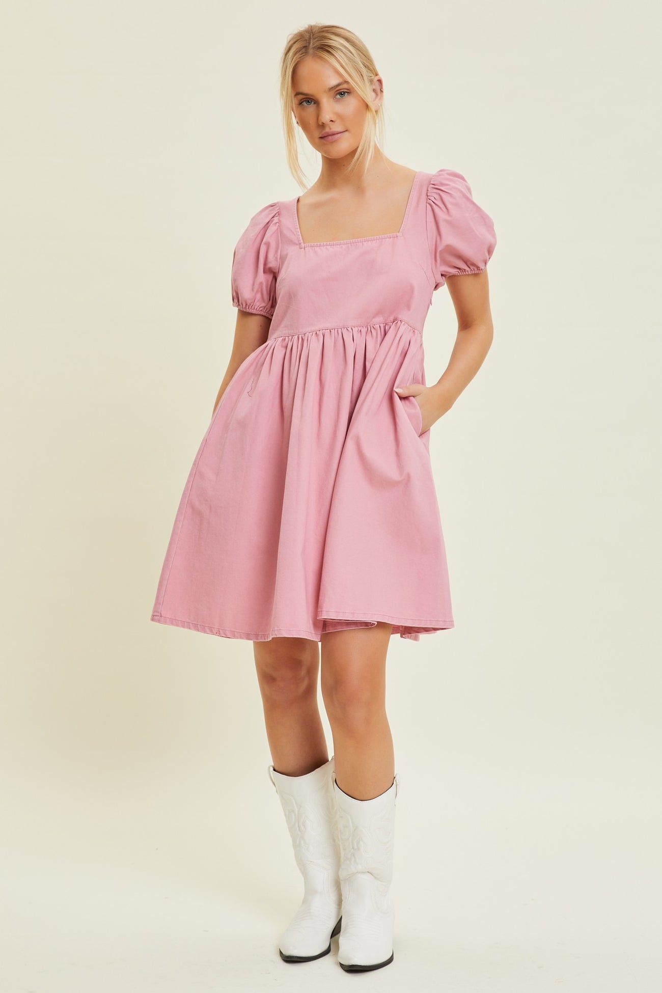 A solid hued dress featuring short puff sleeves, side pockets, a self-tie back and a square neckline.