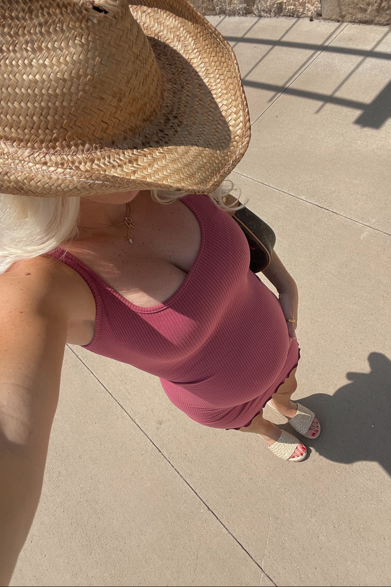 A sleeveless, rib knit maternity dress featuring a squared neckline and a lettuce trim hem.