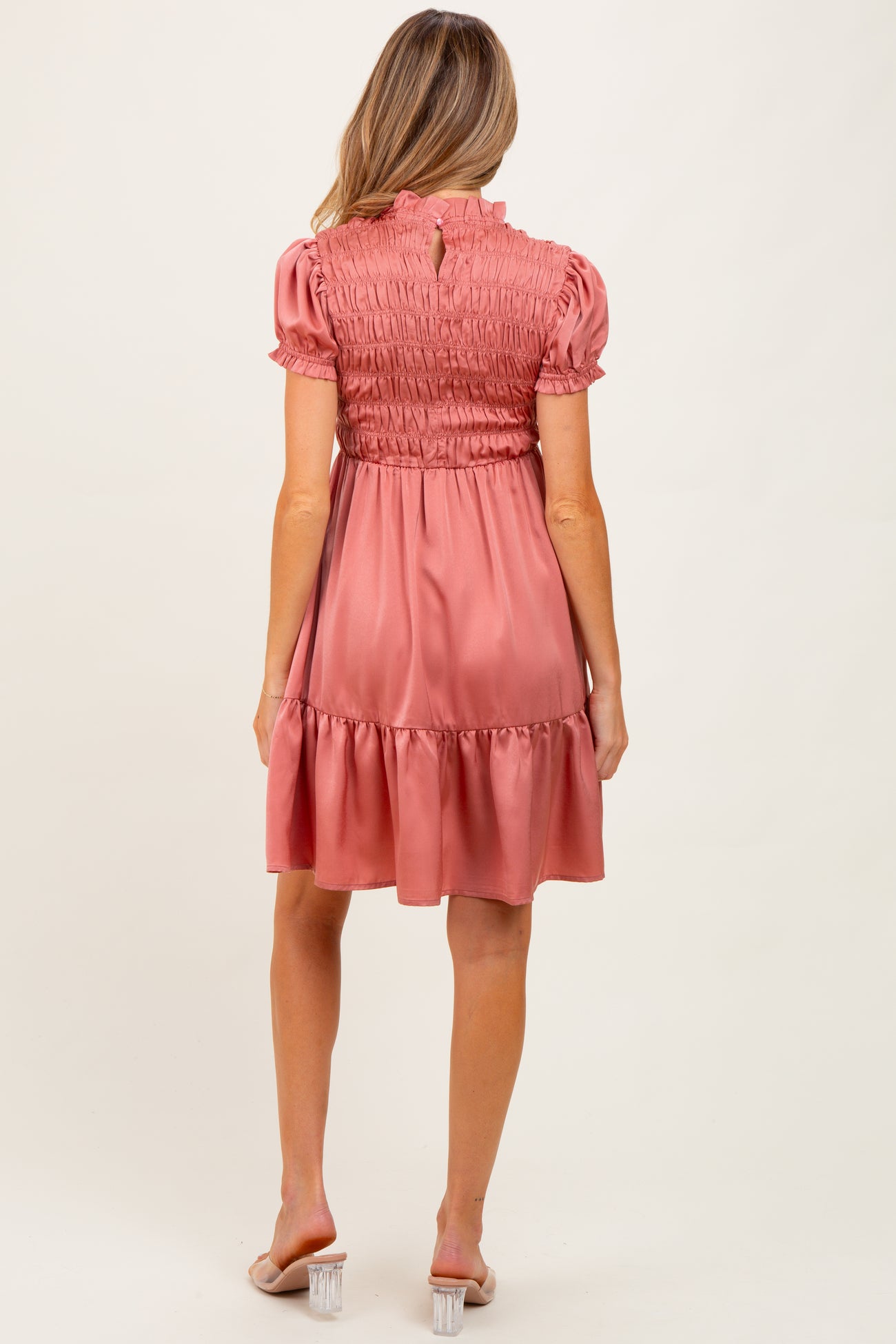 Mauve Satin Smocked Mock Neck Maternity Dress