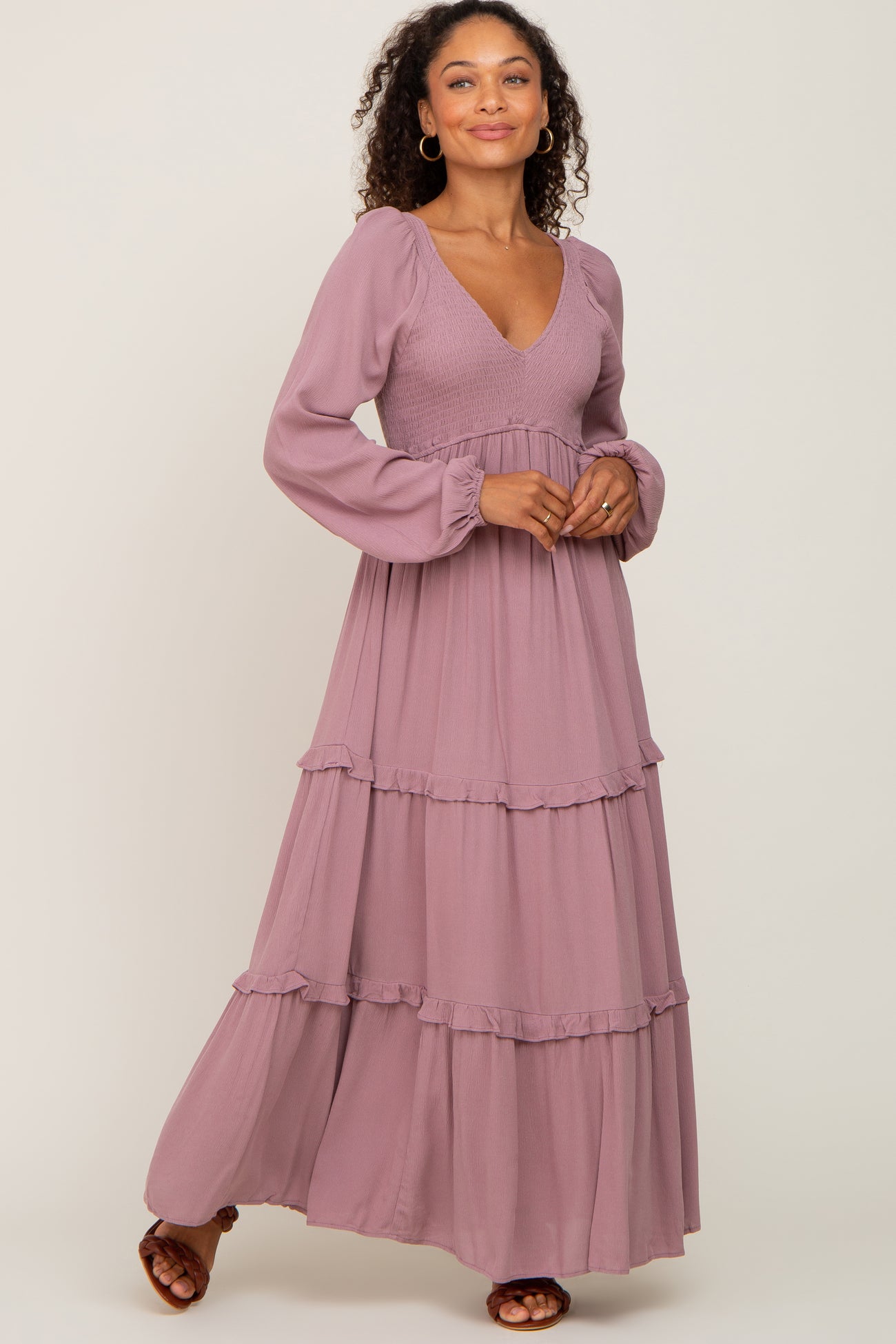 A solid midi dress with a v-neckline, smocked bodice, bubble sleeves and tiered skirt. Skirt is double lined.