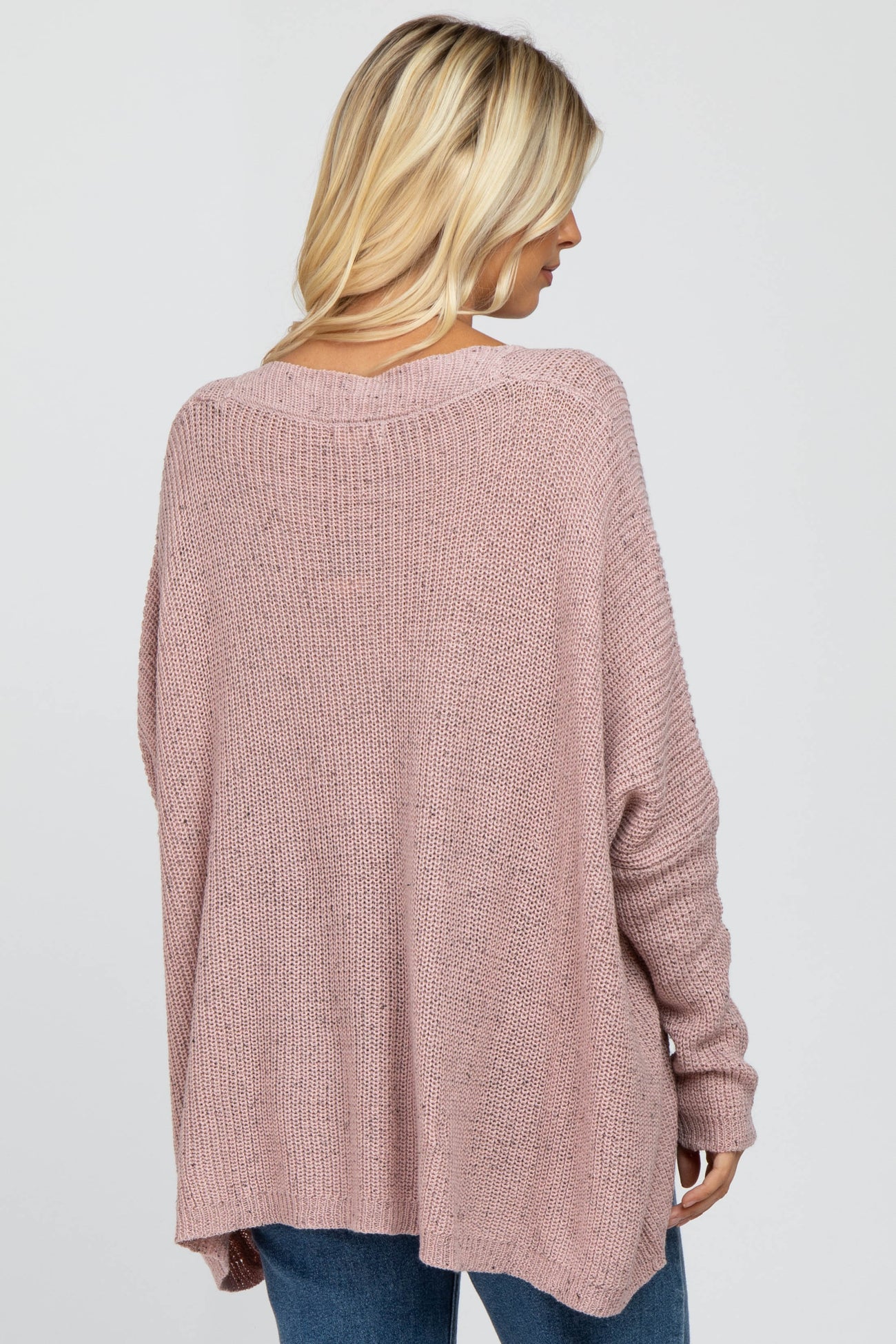 A speckled sweater featuring long drop sleeves, a hi-low hemline, and a v-neckline.