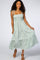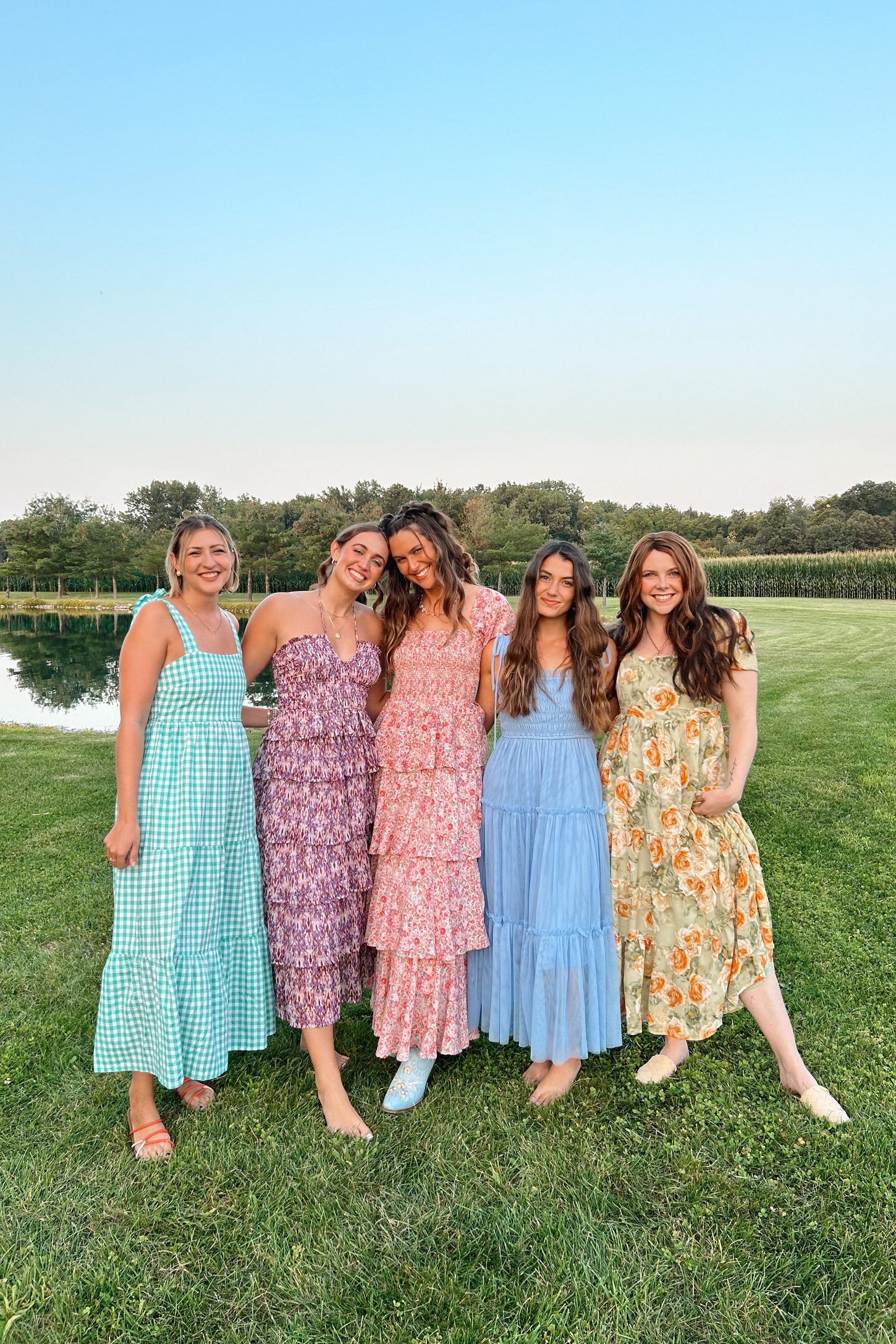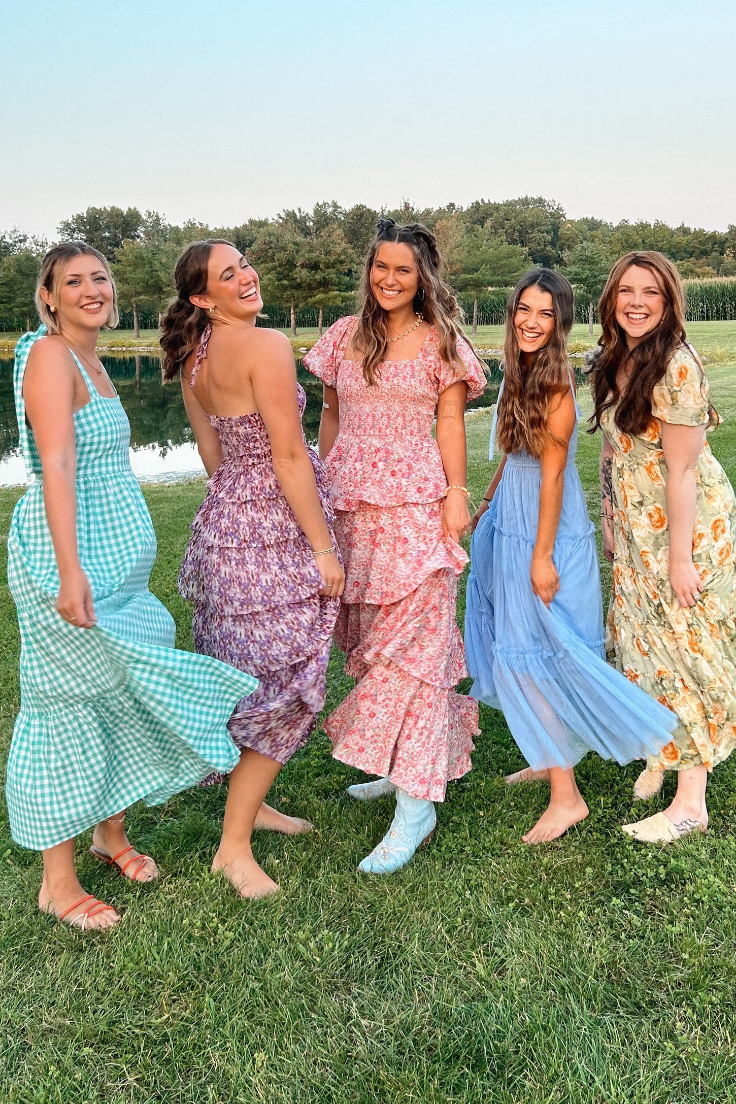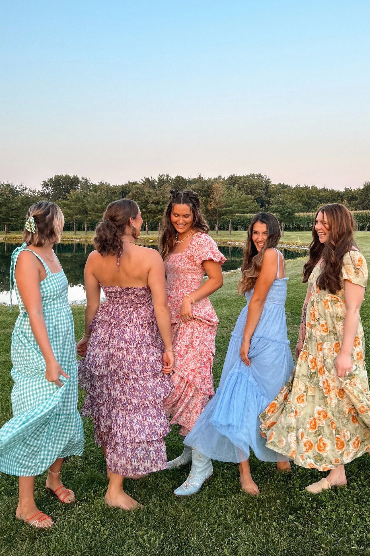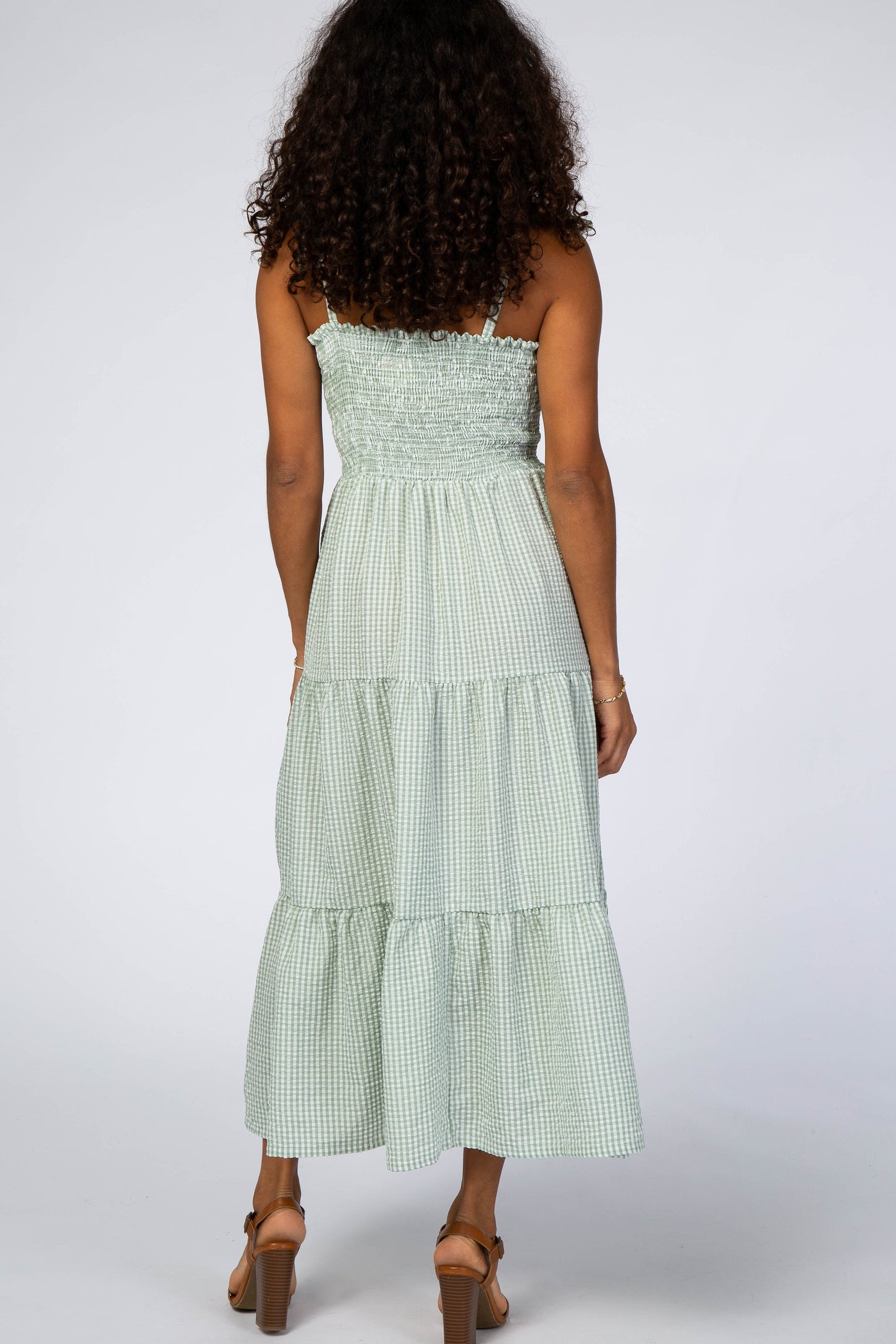A checkered midi dress featuring a smocked bust, a tiered body, side pockets and a self-tie straps.