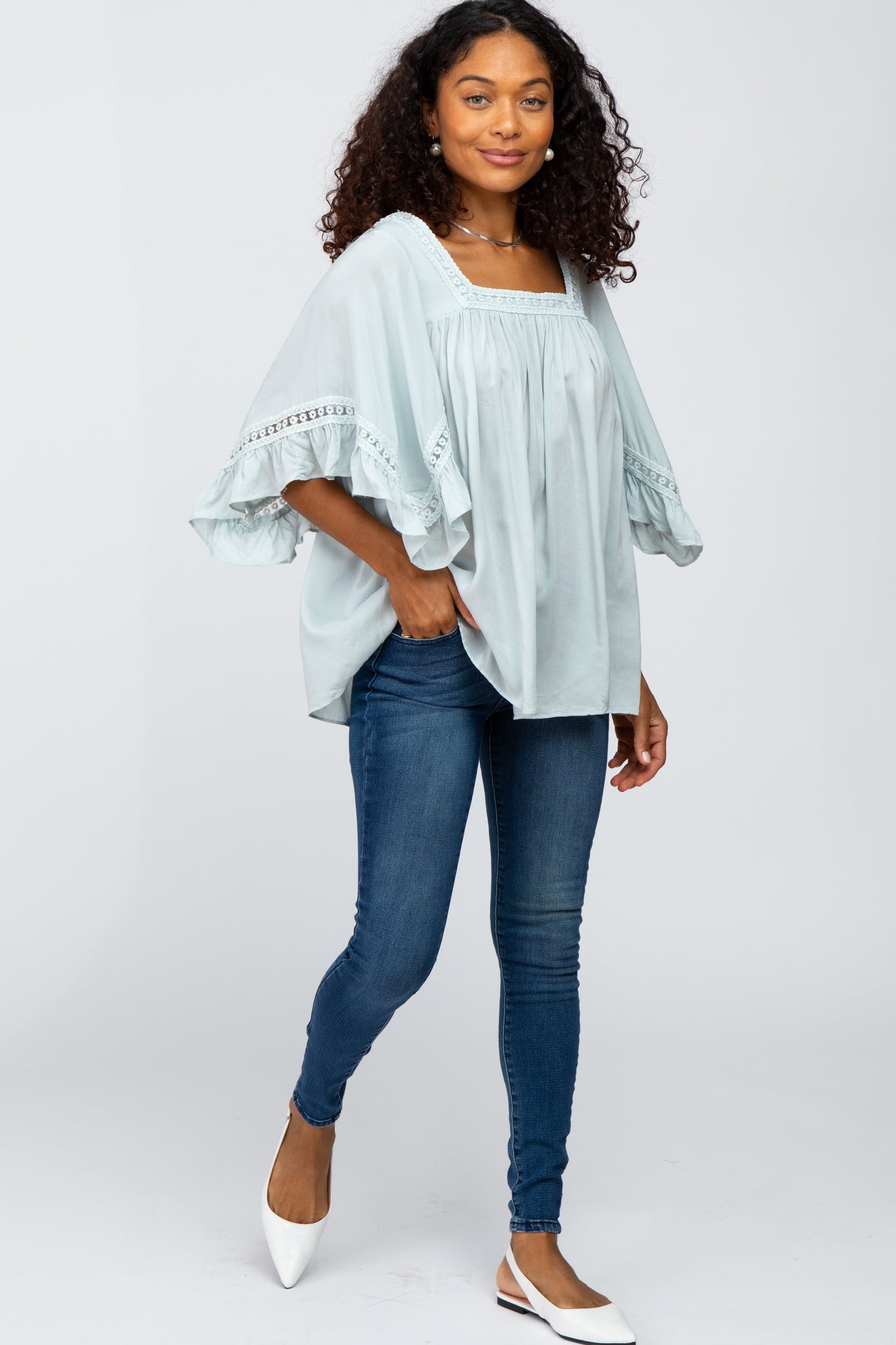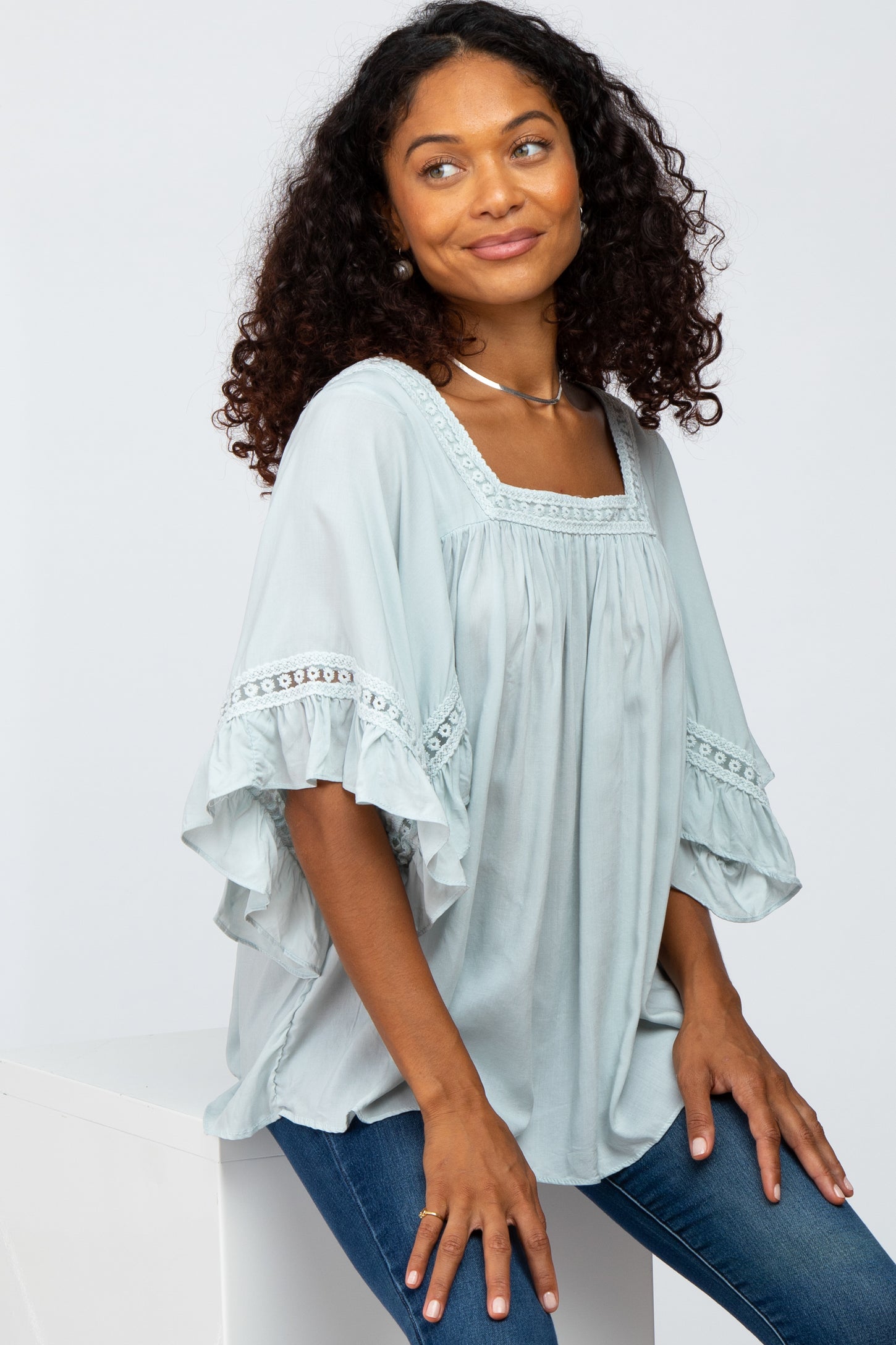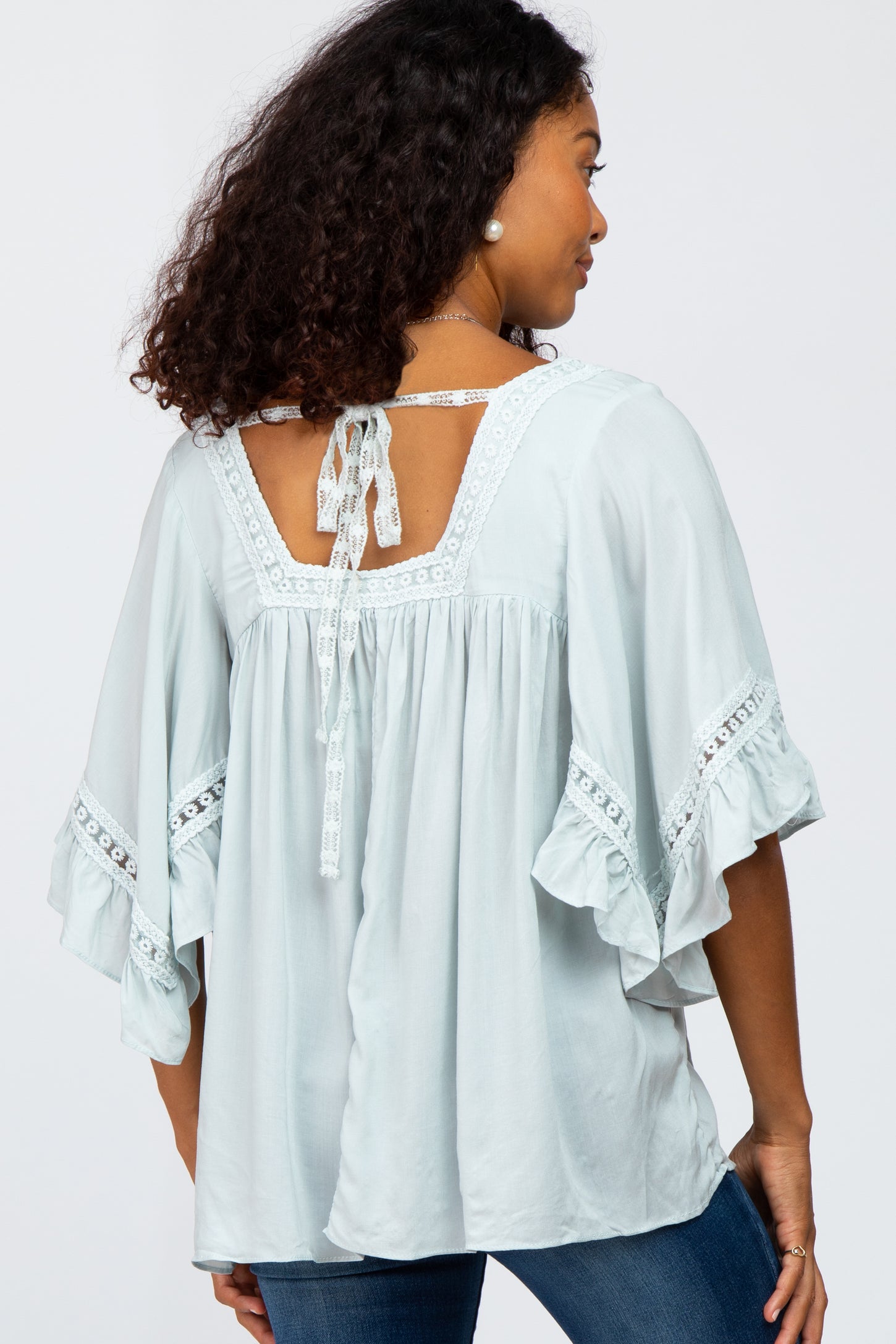 Details A solid short sleeve blouse featuring embroidered lace details, self tie back, and ruffle oversized sleeves. Content + Care