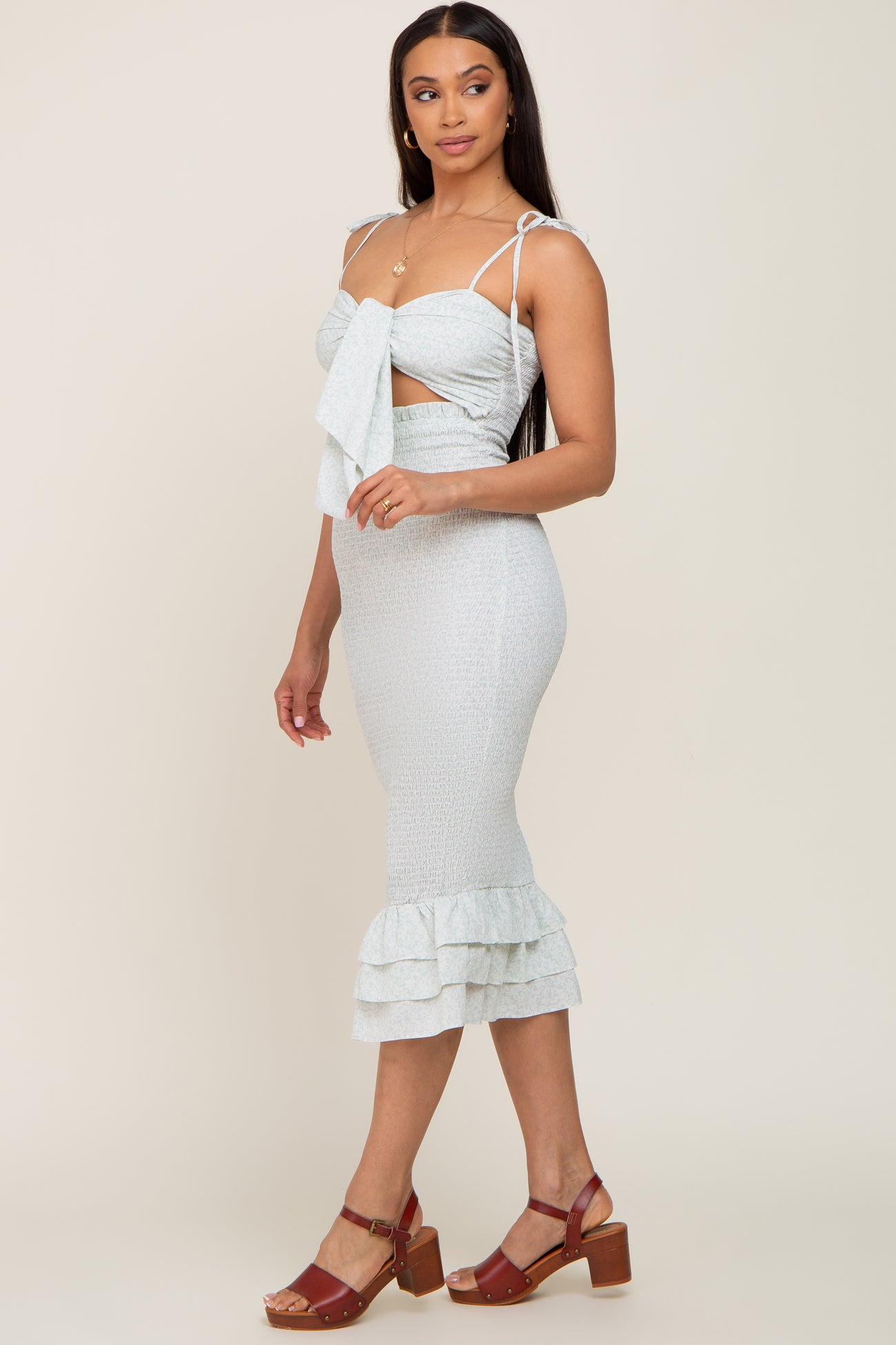 Mint Green Floral Knot Front Smocked Midi Dress