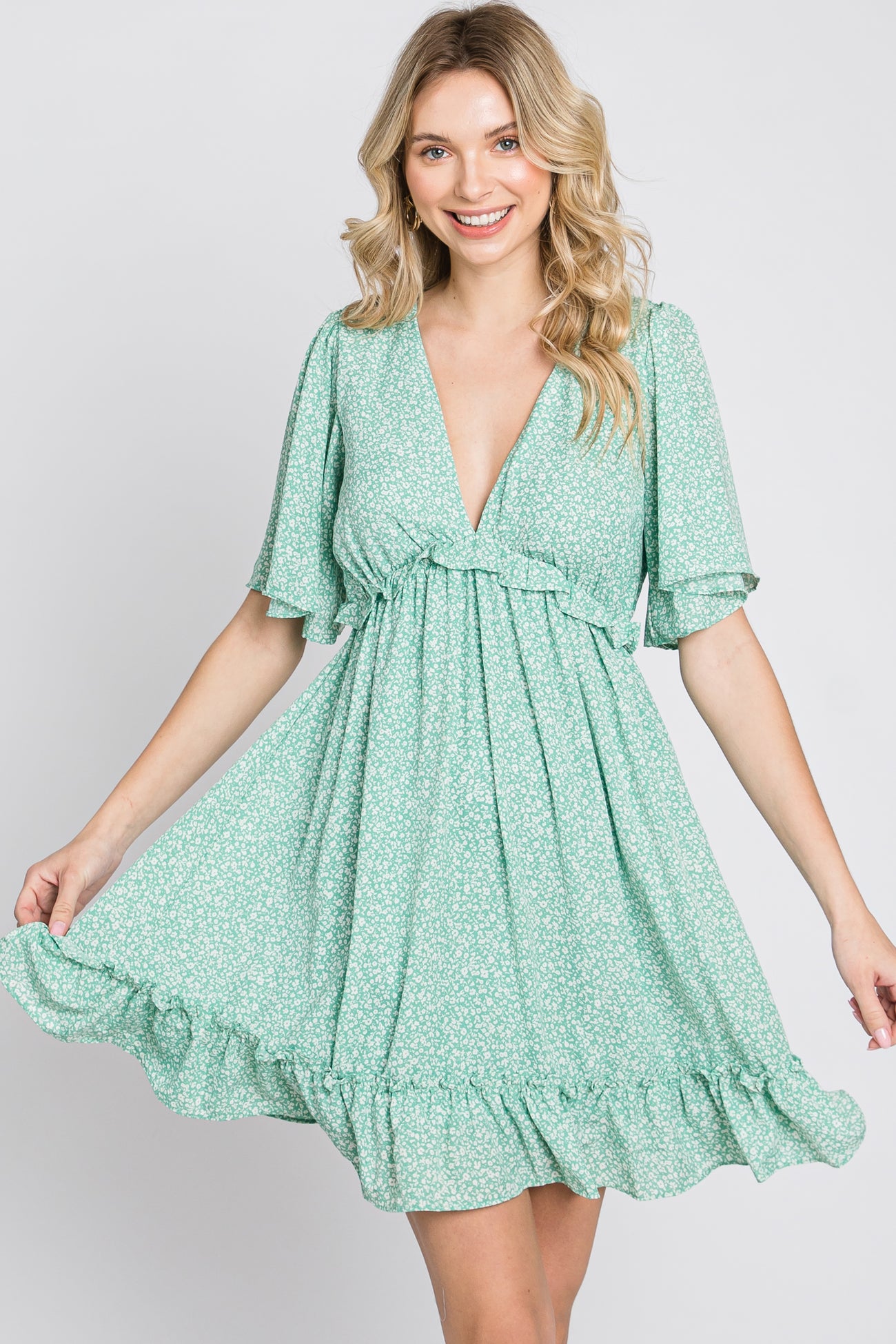 Mint Green Floral Ruffle Accent Cutout Dress