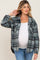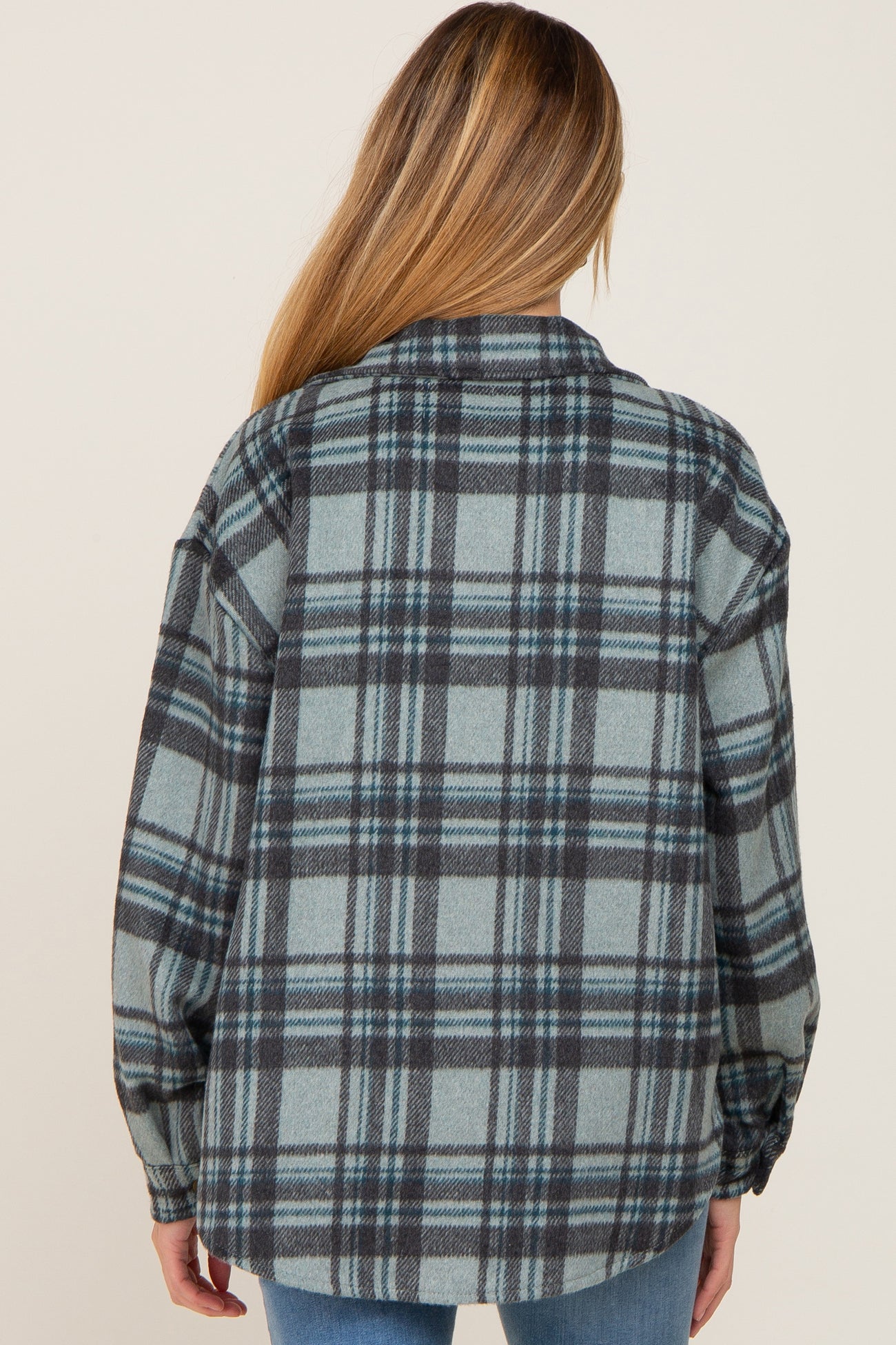 A plaid maternity shirt jacket featuring a soft brushed outside, two front pockets, a collar, front buttons, and a hi-lo rounded hem.