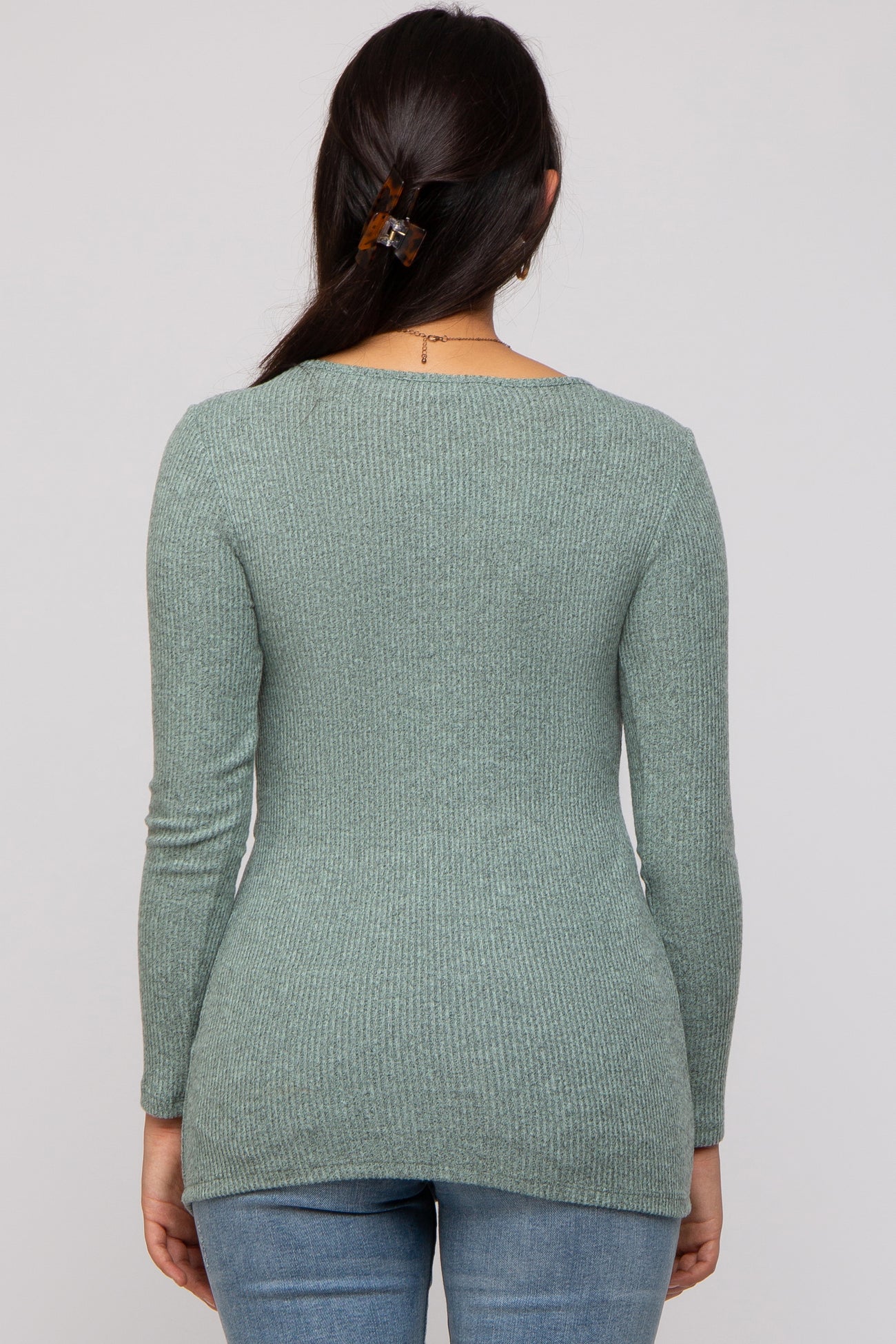 A solid brushed knit rib long sleeve top with a layered crossover top for nursing access.