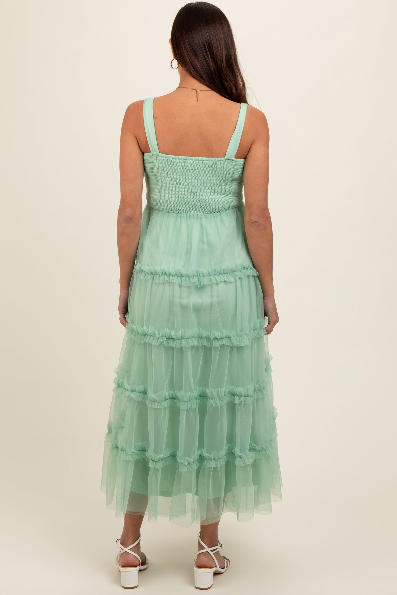 Mint Green Smocked Ruffle Tiered Tulle Maternity Midi Dress