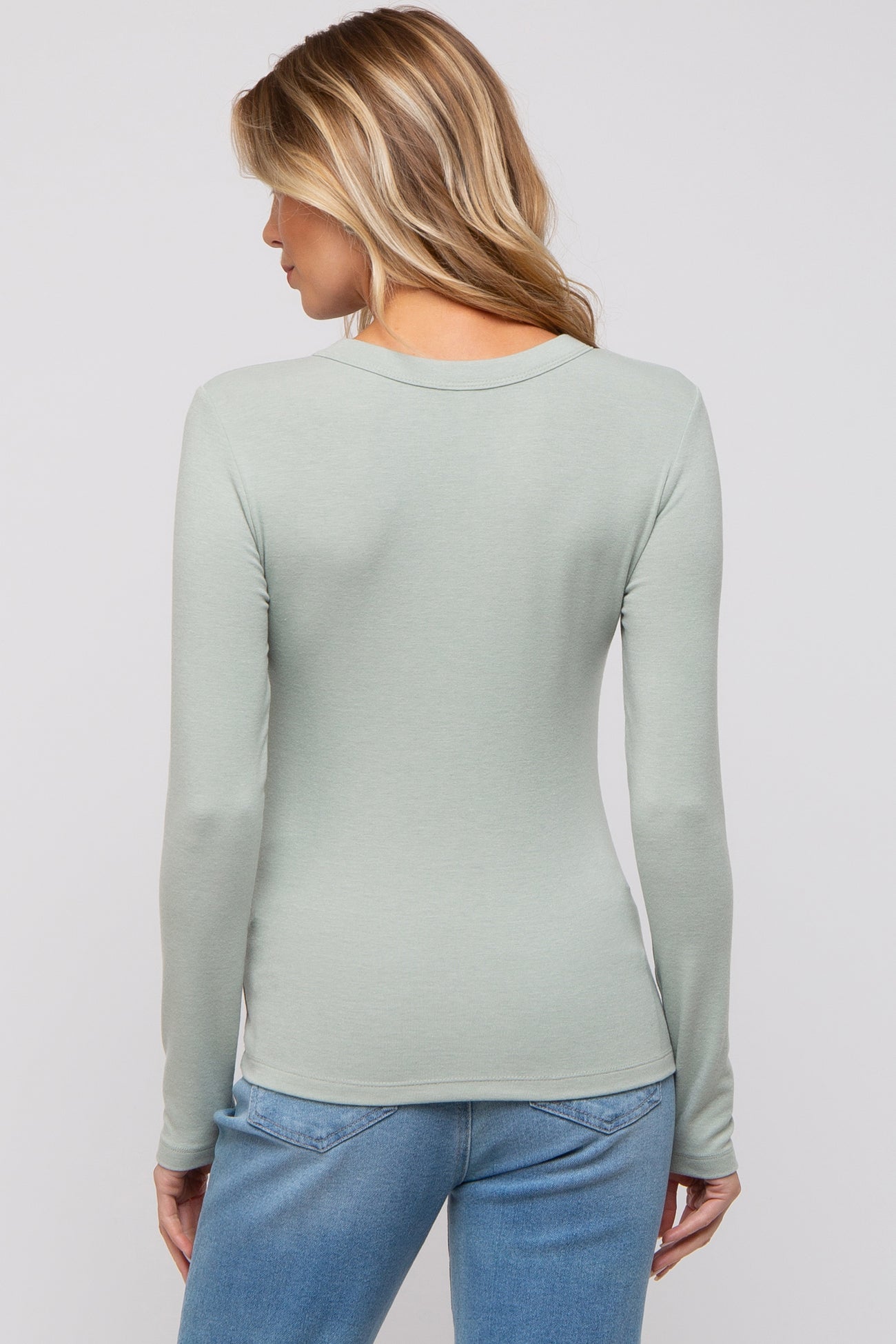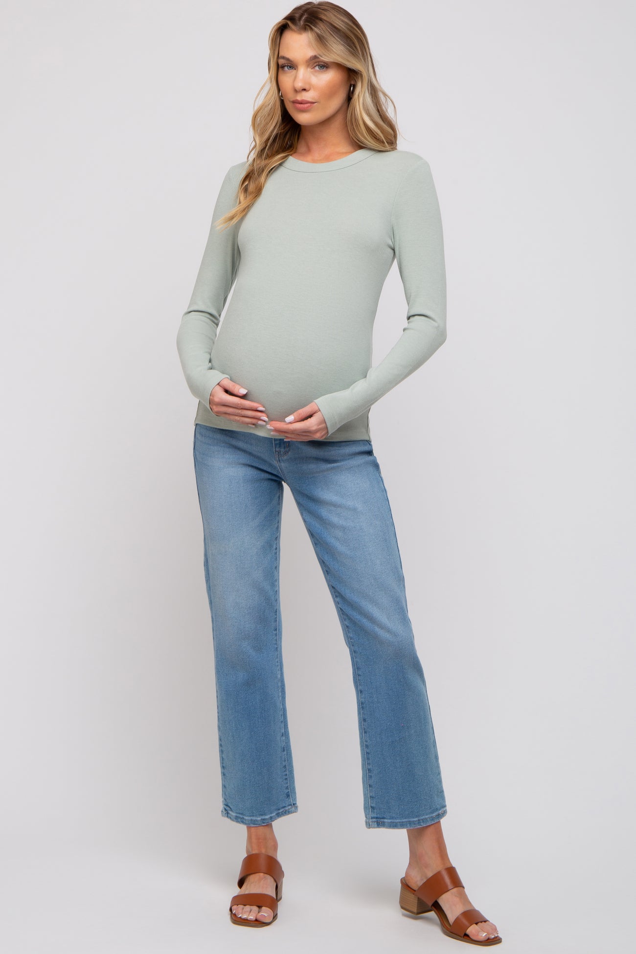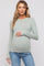 A solid hued maternity top featuring long sleeves and a rounded neckline.