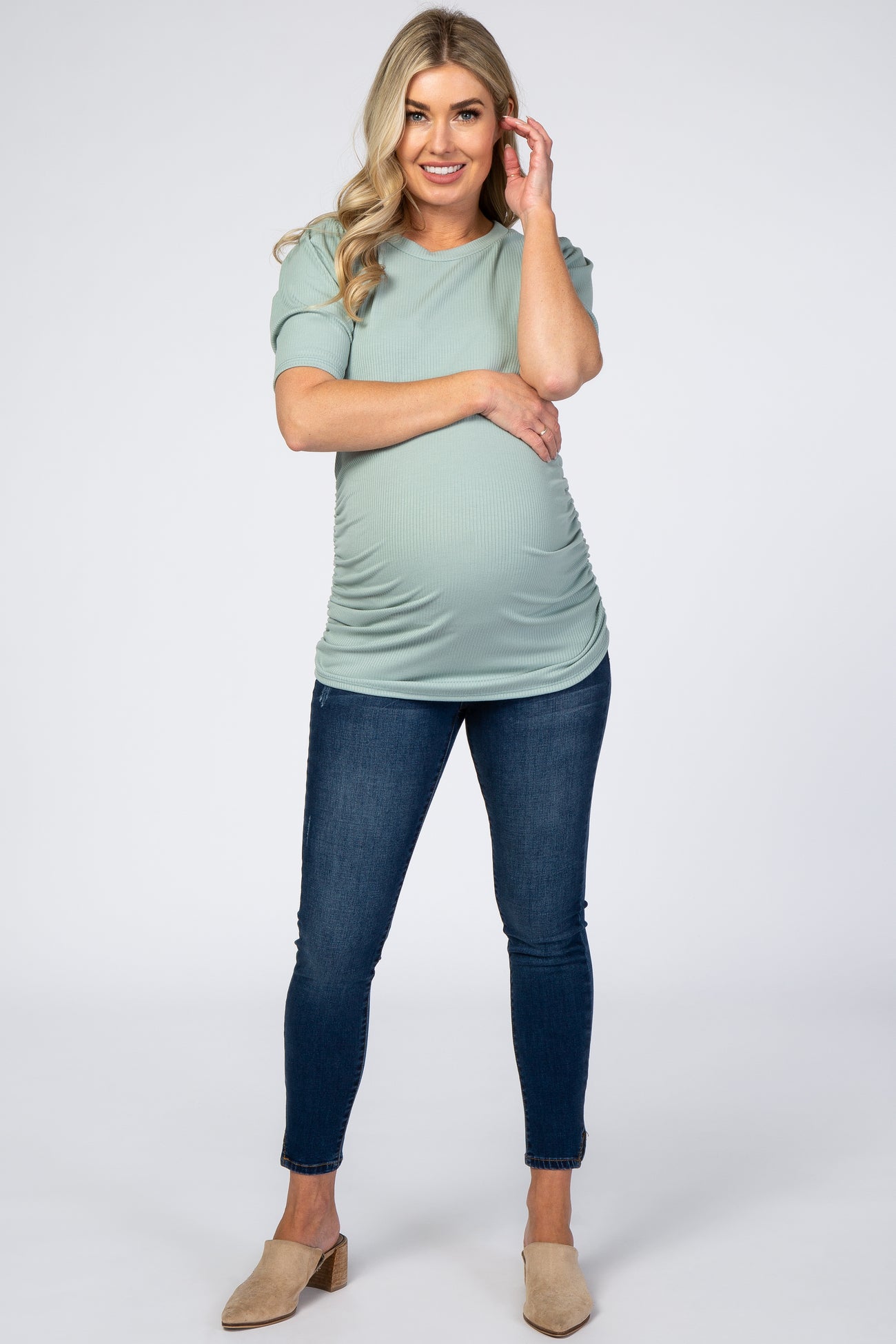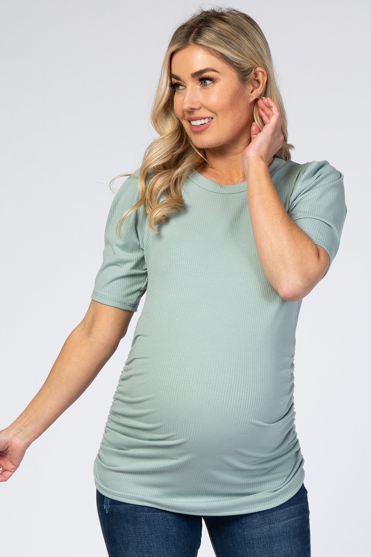 A solid hued ribbed maternity top featuring side ruching, fitted sleeves and a rounded neckline.