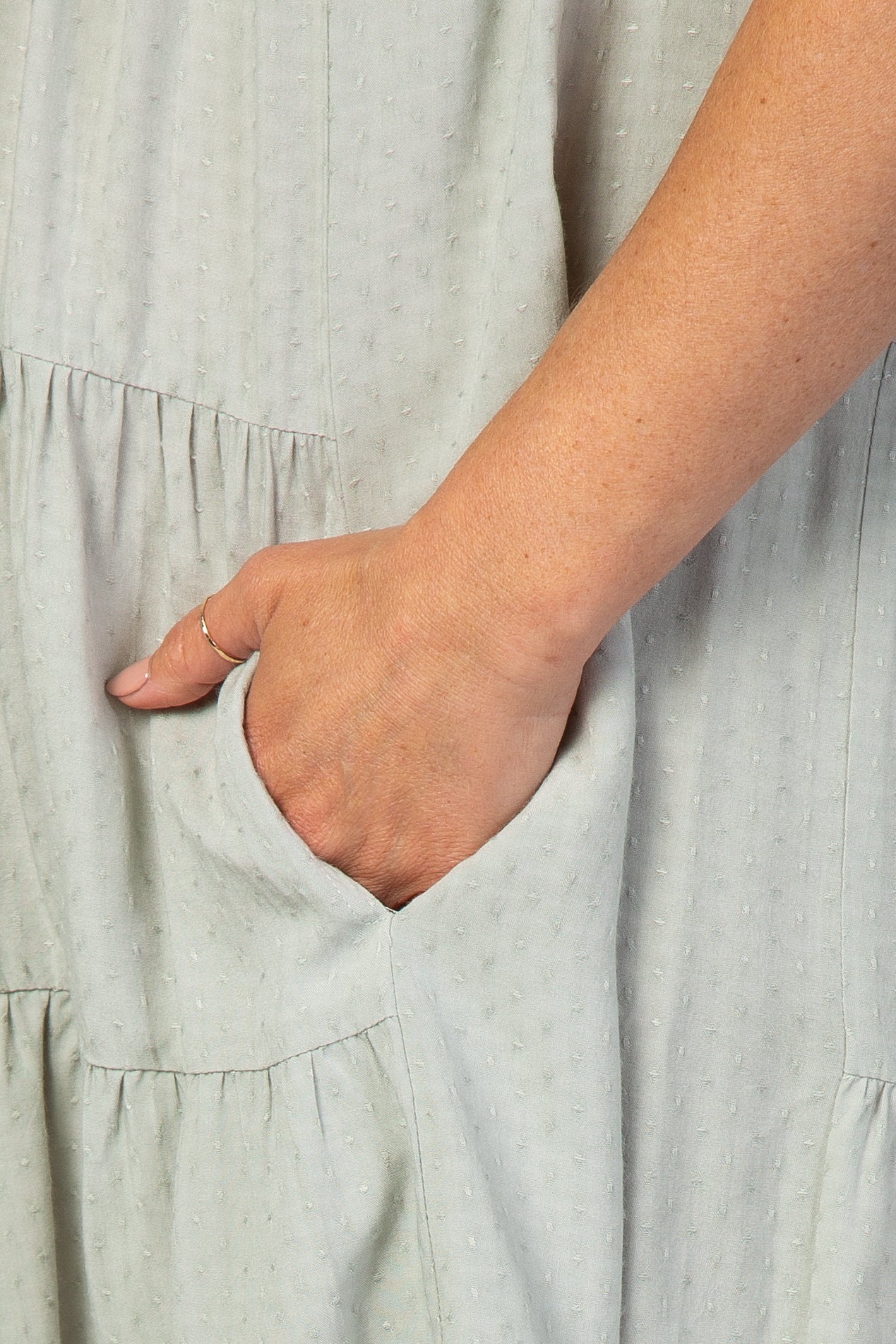 A tiered dress in a textured material with a rounded neckline and ruffle sleeves.