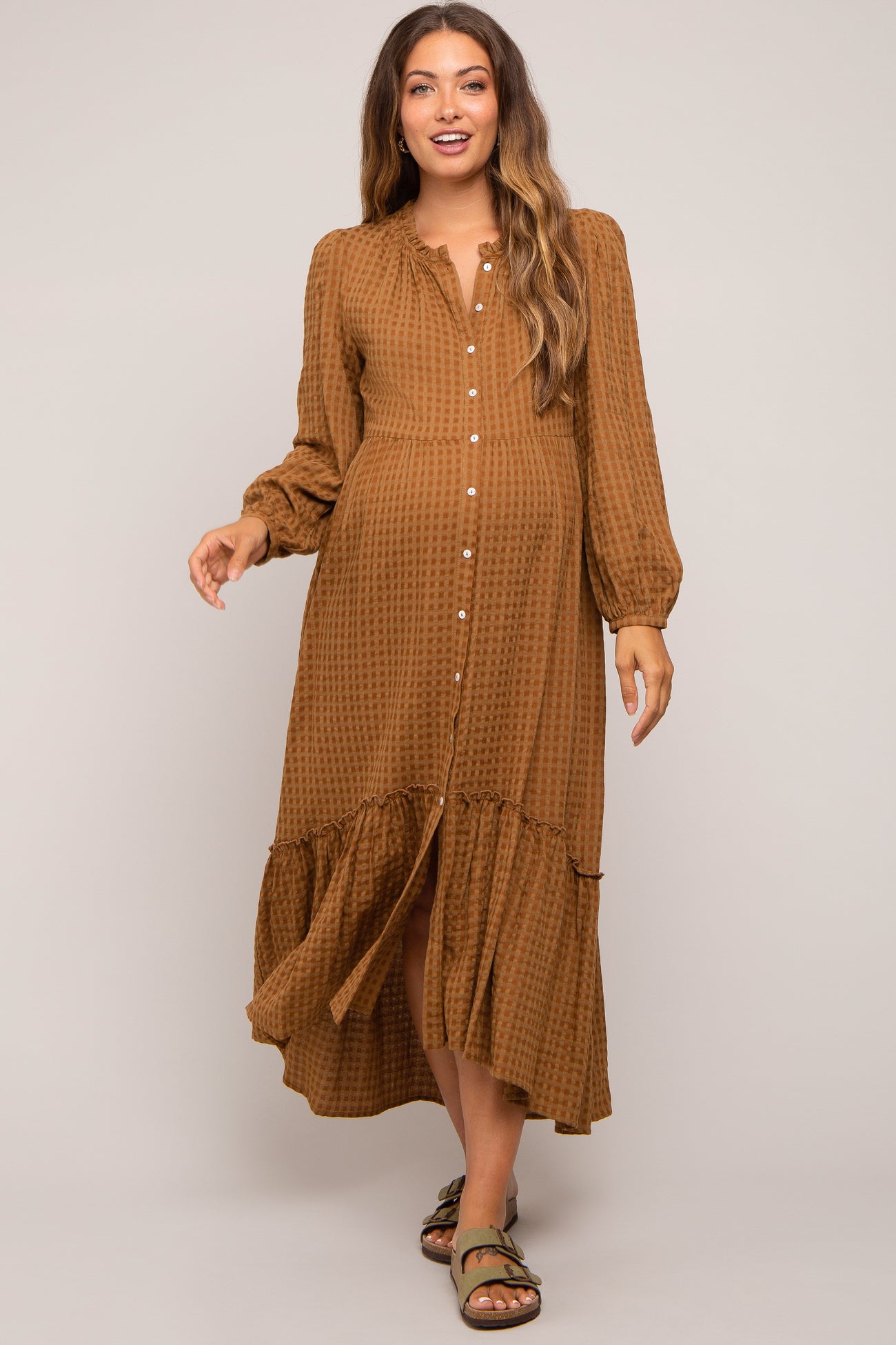 Mocha Gingham Button Maternity Midi Dress