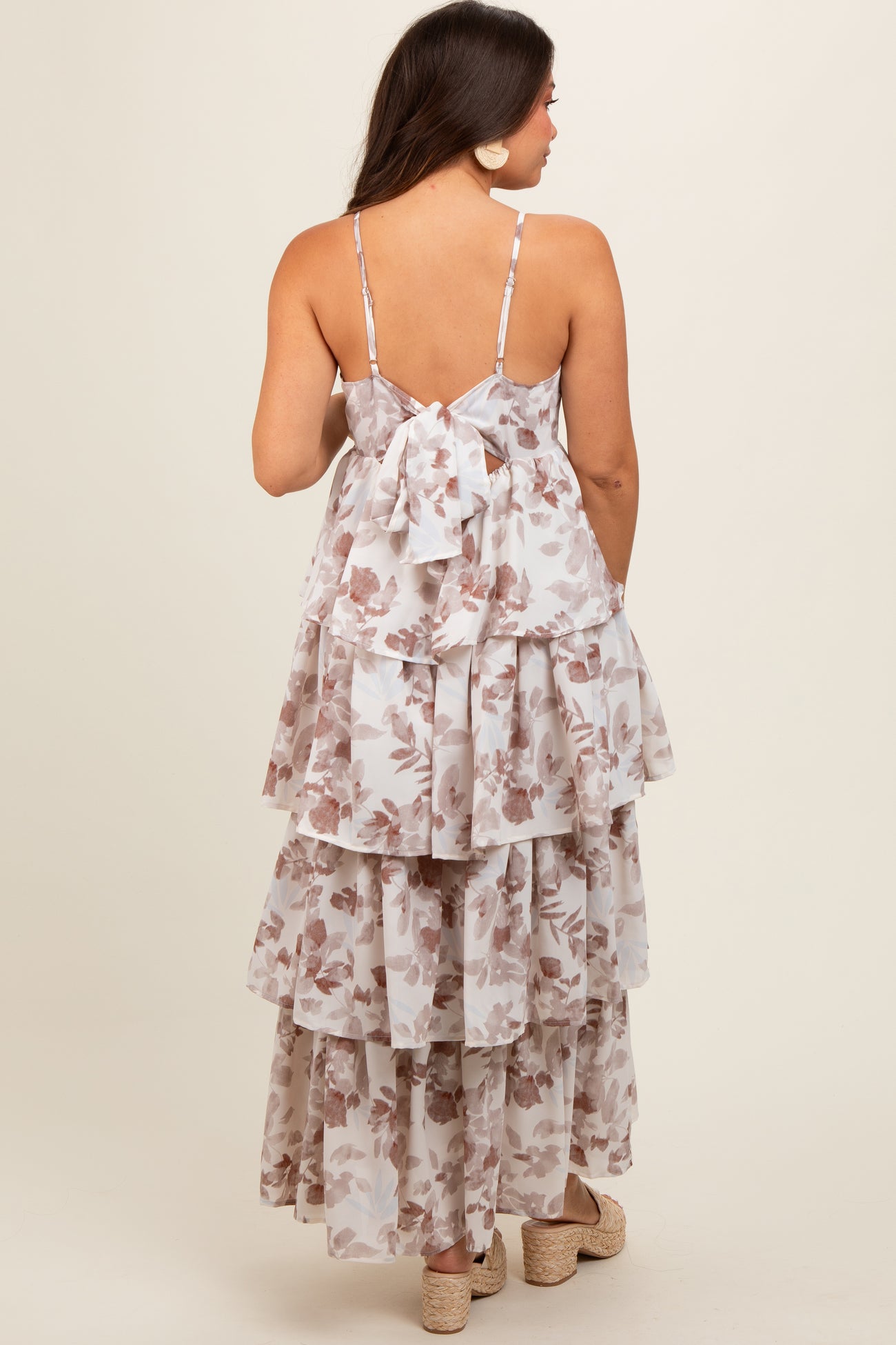 Mocha Leaf Print Square Neck Cut-Out Back Ruffle Tiered Maternity Midi Dress