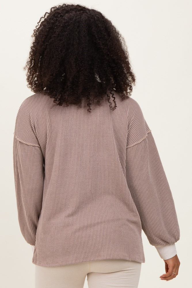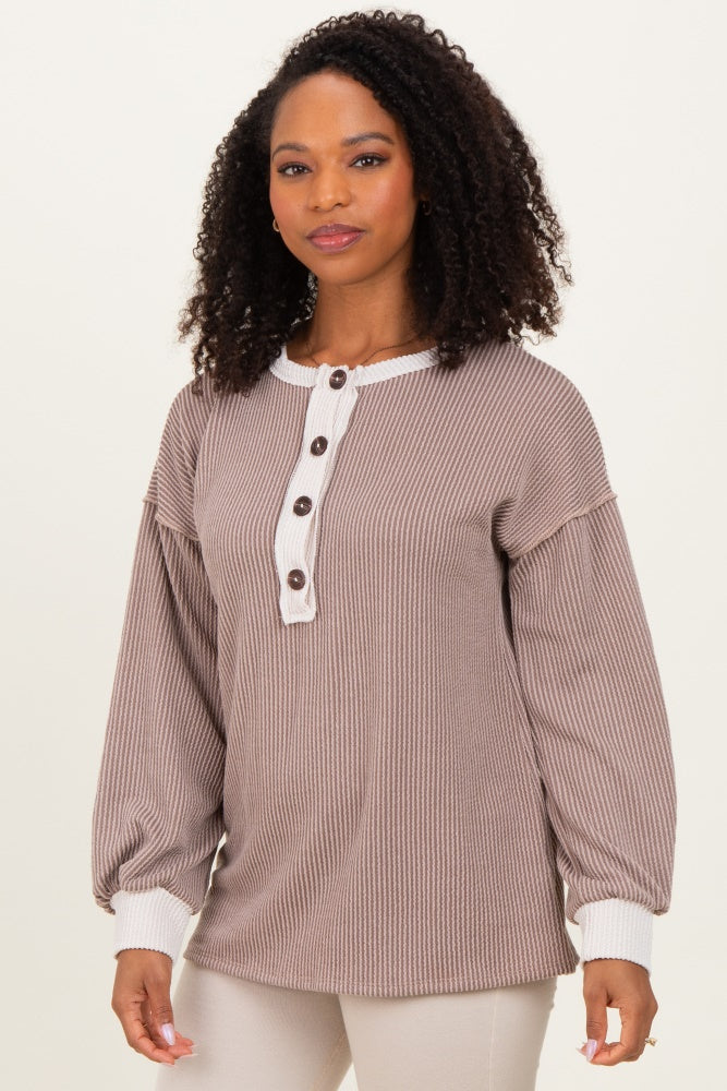 Mocha Long Sleeve Contrast Button Detail Rib Top