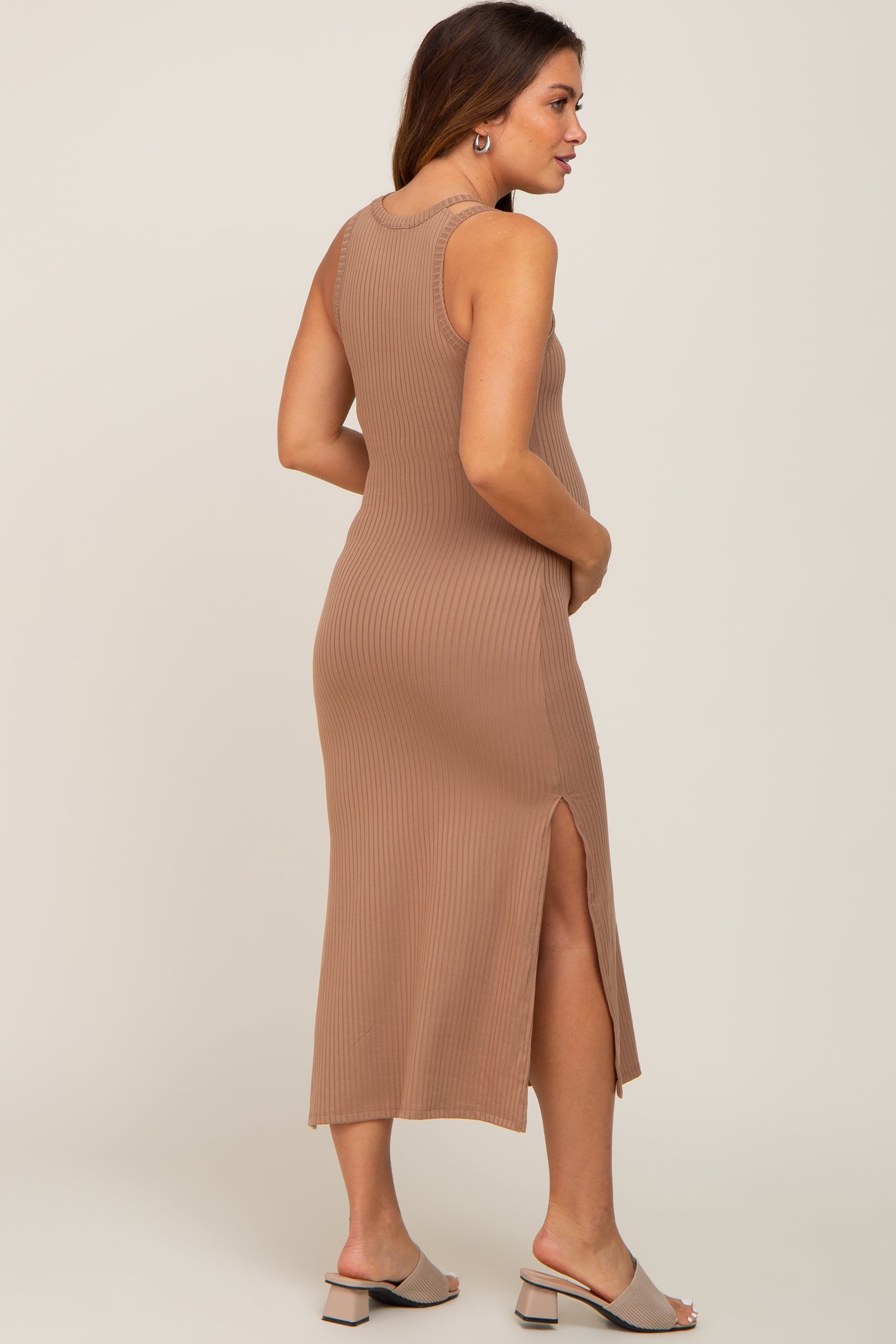 Mocha Ribbed Cutout Shoulder Side Slit Maternity Midi Dress