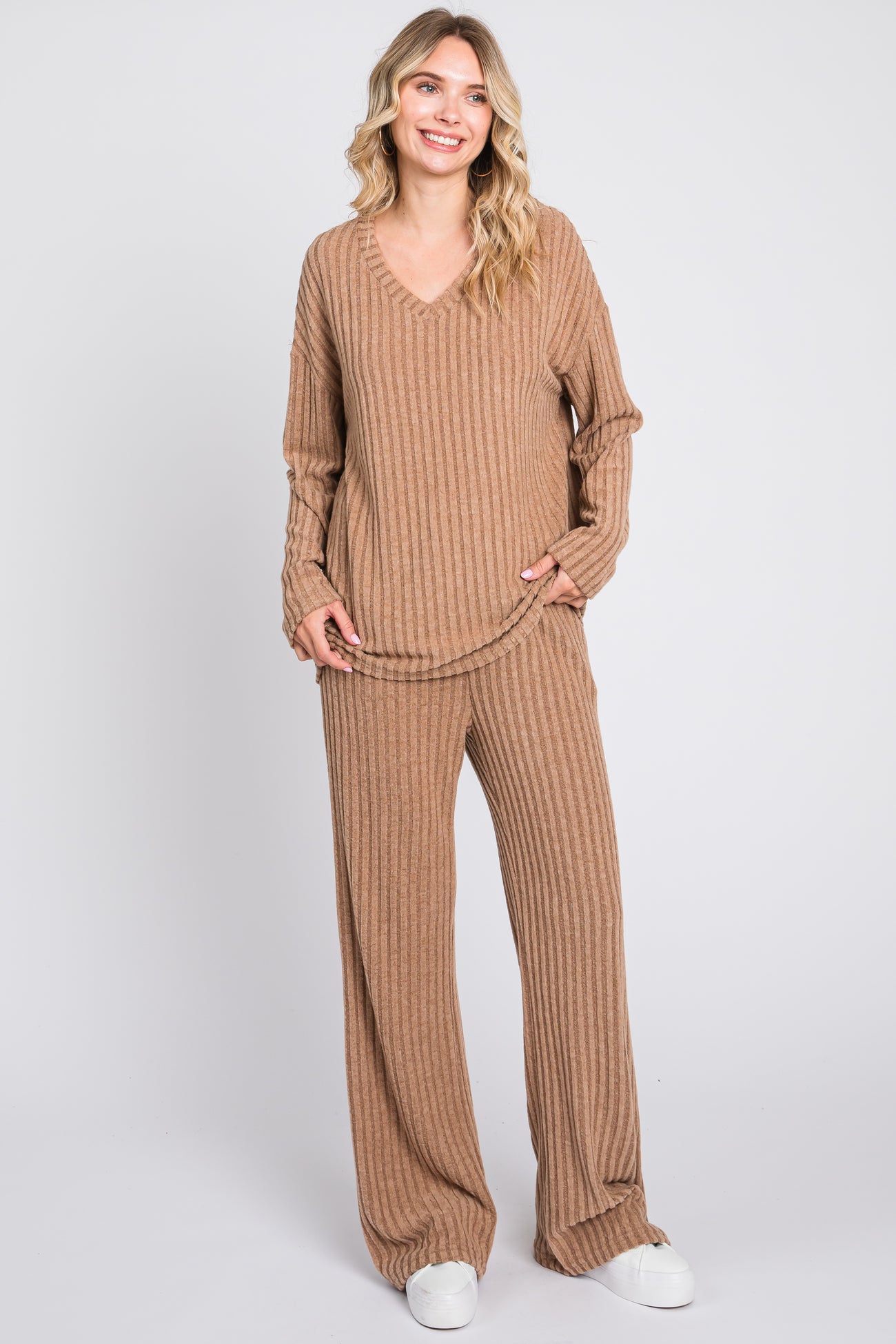 A ribbed knit pajama set featuring a long sleeve top and pocketed long pants.