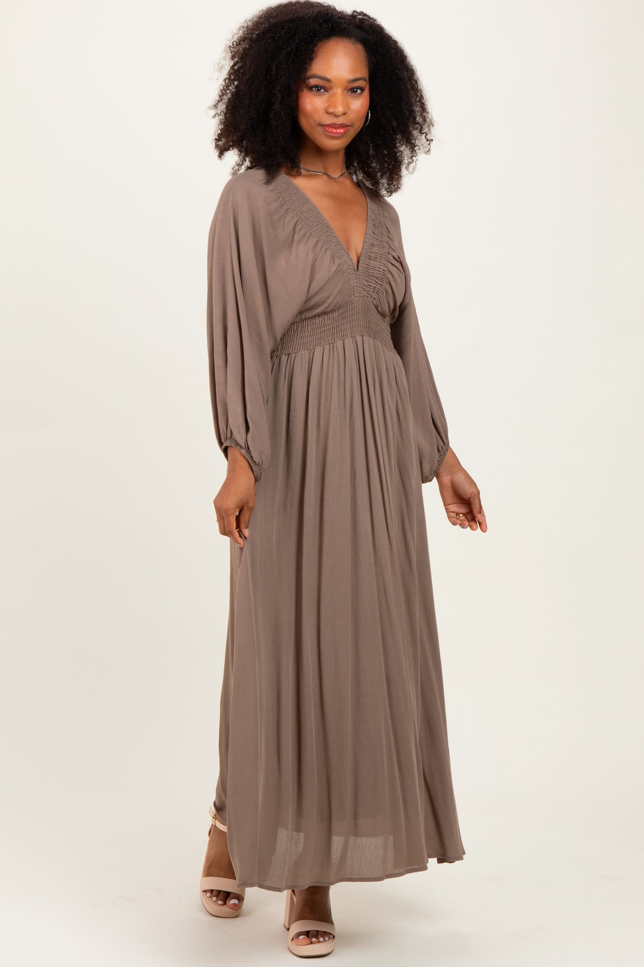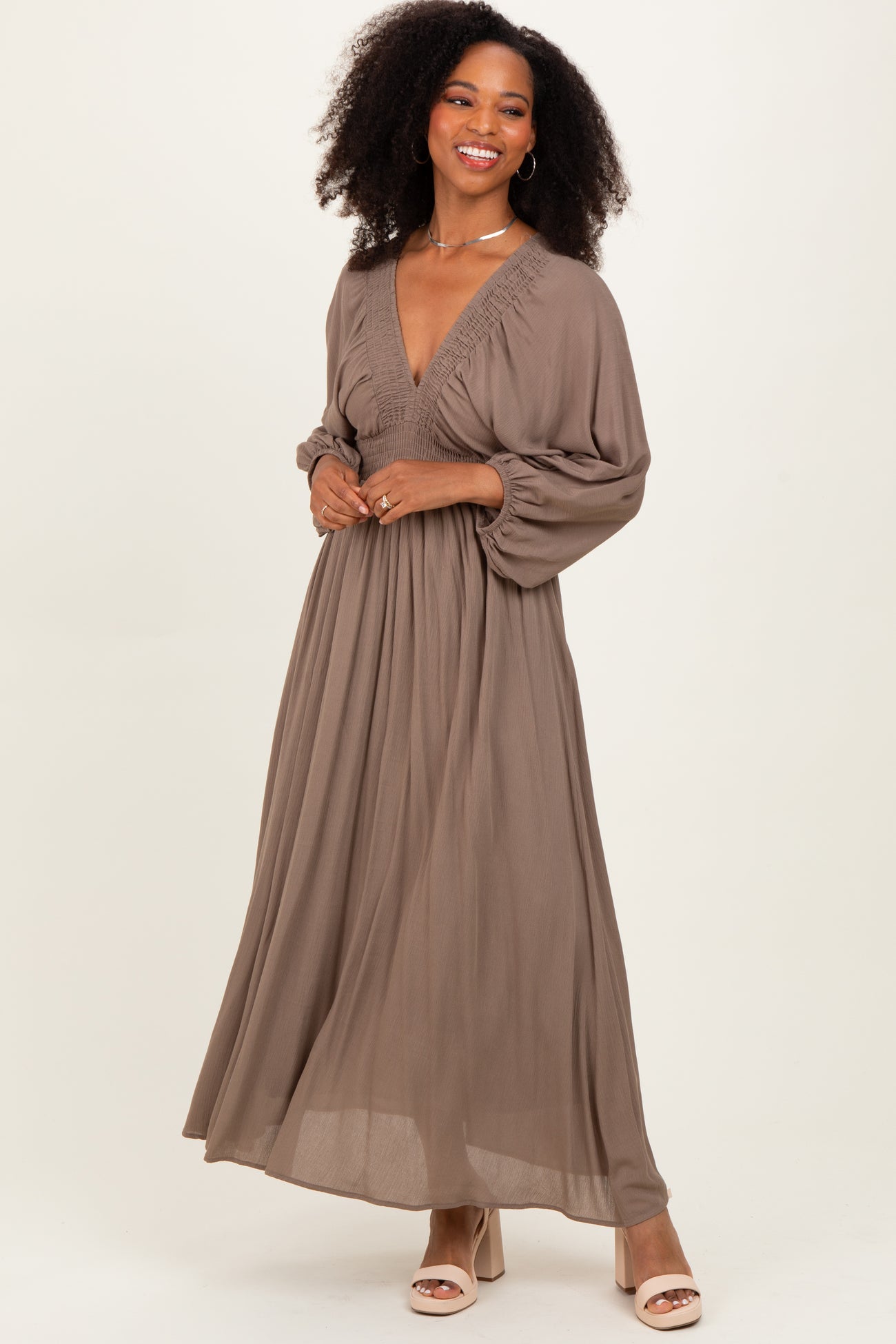 Mocha Solid Long Sleeve V-Neck Smocked Detail Maxi Dress