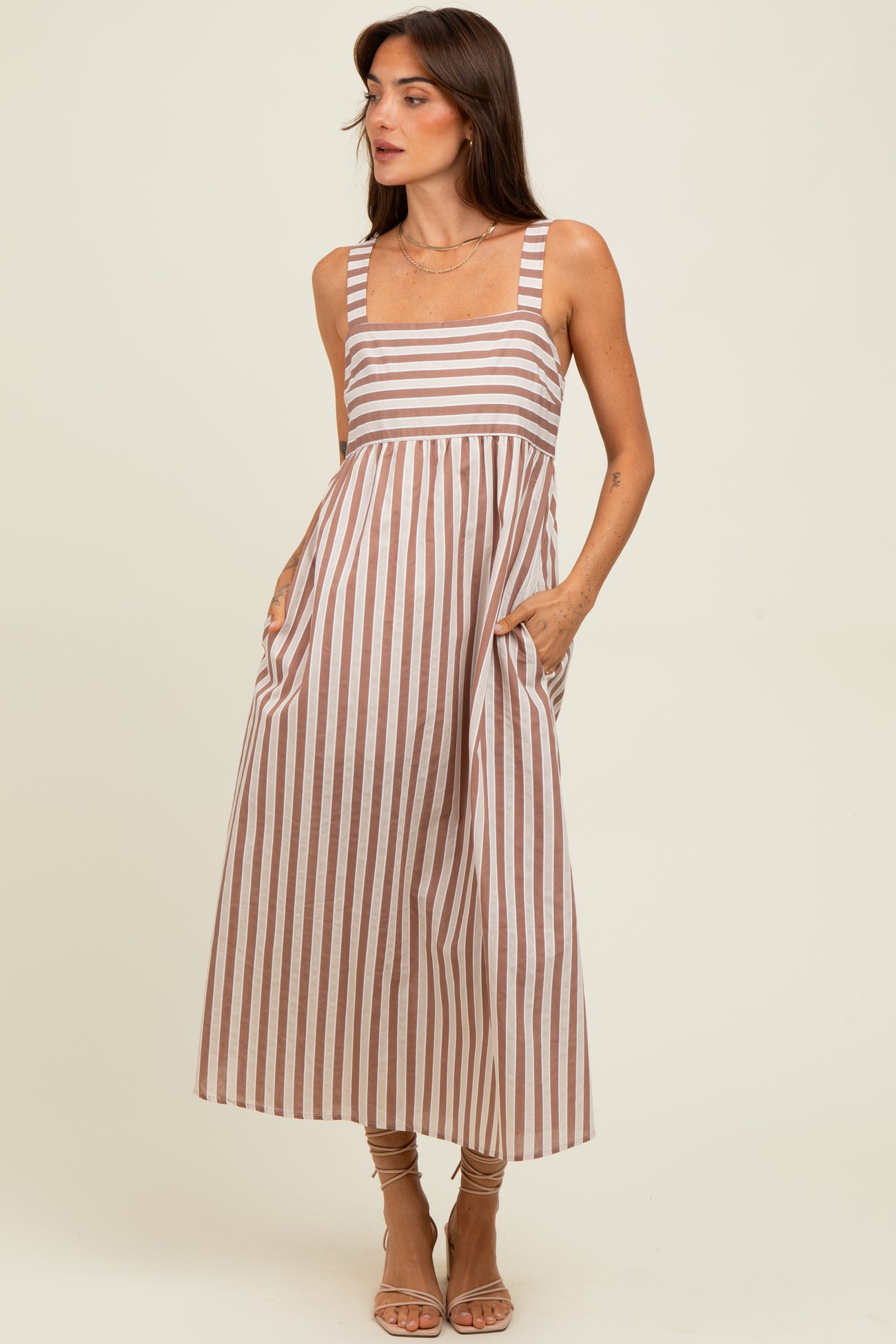 Stay comfortable and stylish throughout your pregnancy with this striped sleeveless maternity midi dress. Featuring a flattering square neckline and adjustable straps, this dress is designed to accommodate your growing belly with ease. The soft, breathable fabric offers all-day comfort, while the flowy midi length provides a graceful silhouette. Perfect for casual outings or special occasions, this dress includes convenient side pockets for added functionality. Pair it with your favorite sandals or wedges for an effortlessly chic maternity look. Embrace your bump in style with this versatile and elegant dress.