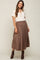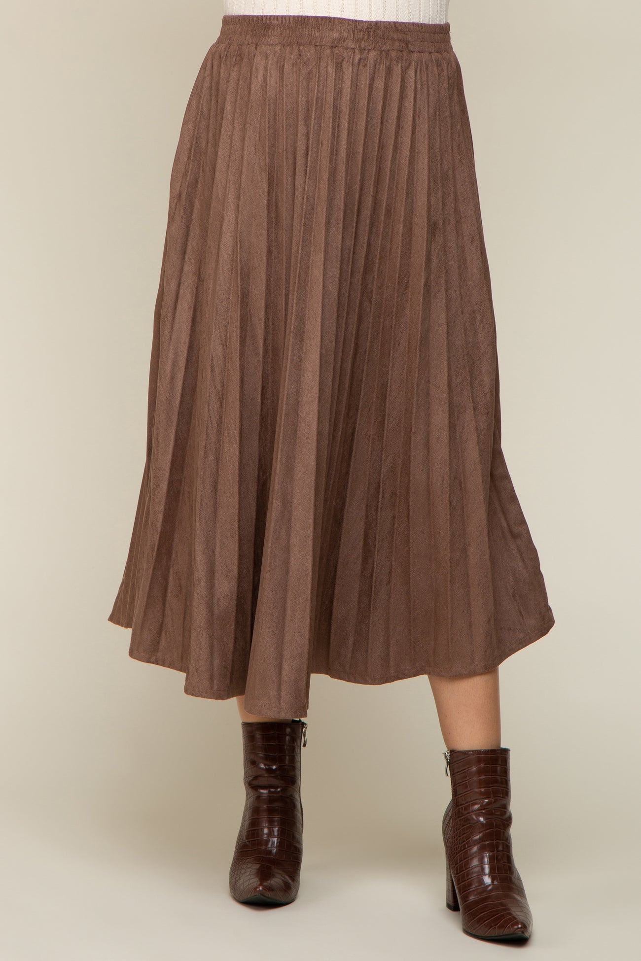Details A solid maternity midi skirt in a faux suede pleated material with an elastic waistband. Content + Care
