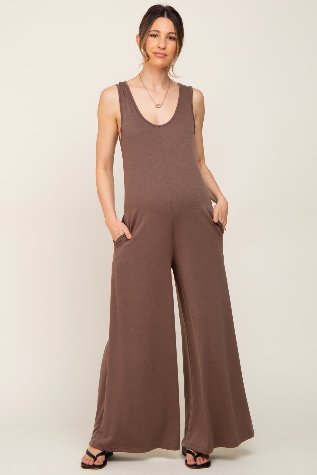 Mocha Wide Leg Sleeveless Maternity Jumpsuit