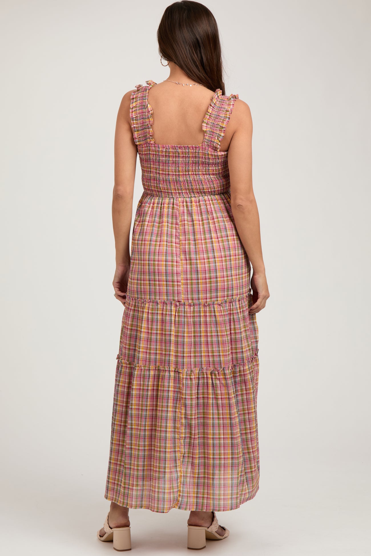 A sleeveless multi-color plaid maternity maxi dress featuring ruffle shoulder straps, a smocked top, a tiered skirt, side pockets and a square neckline.