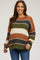 A striped multi-color maternity sweater featuring a rounded neckline and long sleeves.