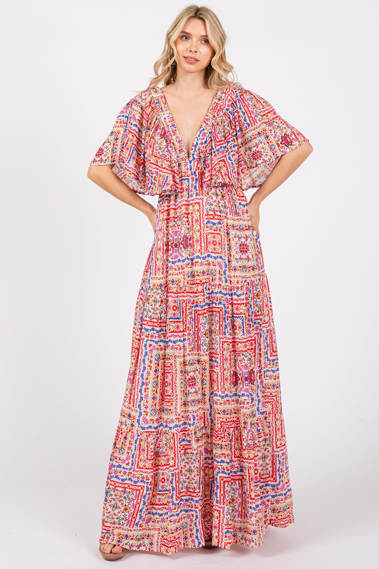 Multicolor Floral Deep V-Neck Tiered Maxi Dress