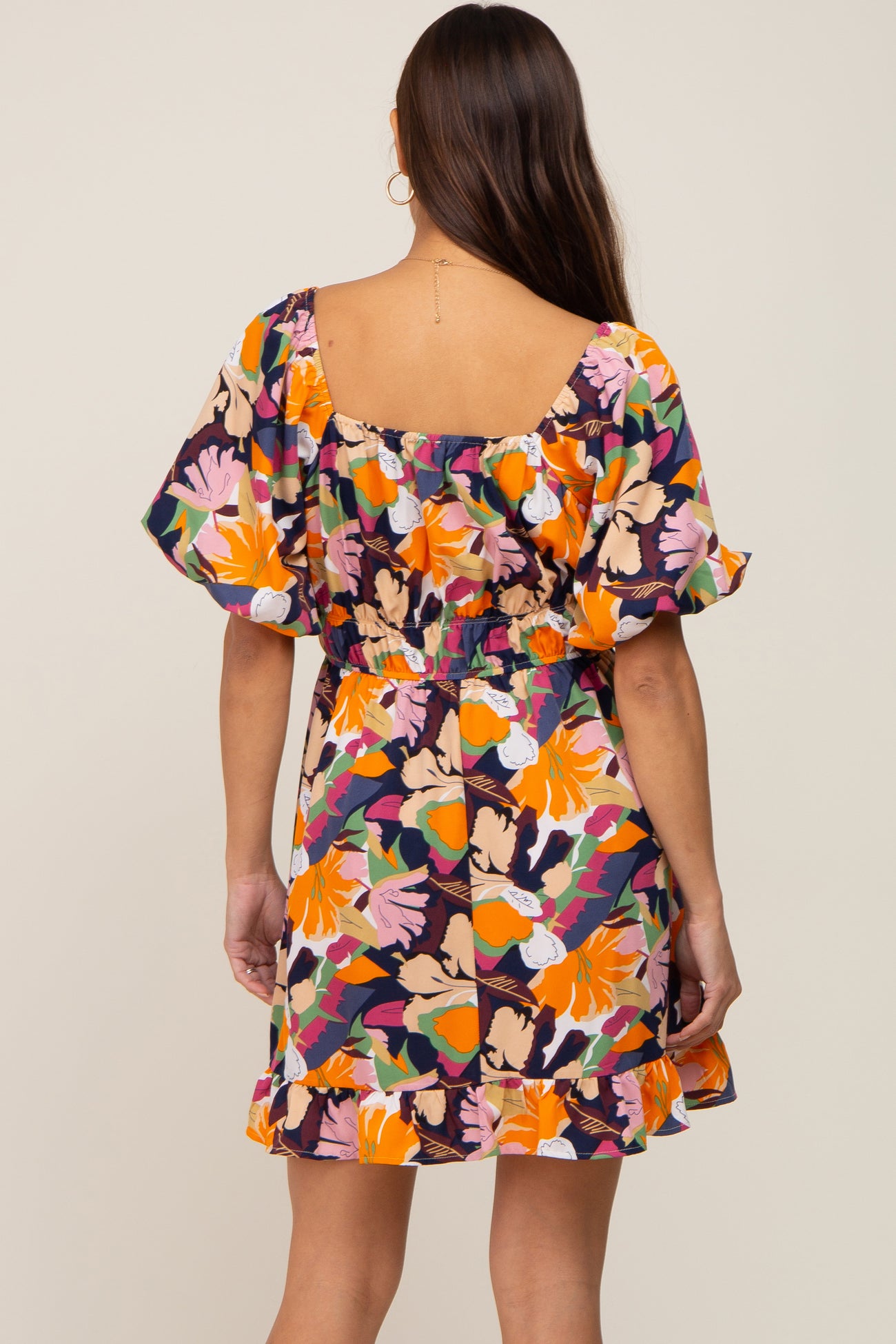 A floral maternity dress with a squared neckline, short puff sleeves, an elastic waist, and a gathered bottom hem.