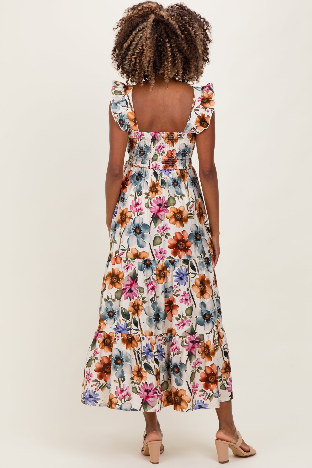 Embrace effortless style and comfort with our Multicolor Floral Smocked Tiered Maternity Maxi Dress. Featuring a vibrant floral print in warm and cool tones, this dress is designed to brighten your maternity wardrobe. The smocked bodice offers a flexible, flattering fit that gently hugs your baby bump while providing support. Delicate ruffle straps add a feminine touch, and the tiered skirt flows beautifully for all-day comfort and movement. Crafted from lightweight, breathable fabric, it's perfect for any occasion—from casual outings to special events. Step into spring and summer with confidence and grace in this must-have maternity maxi dress!