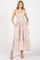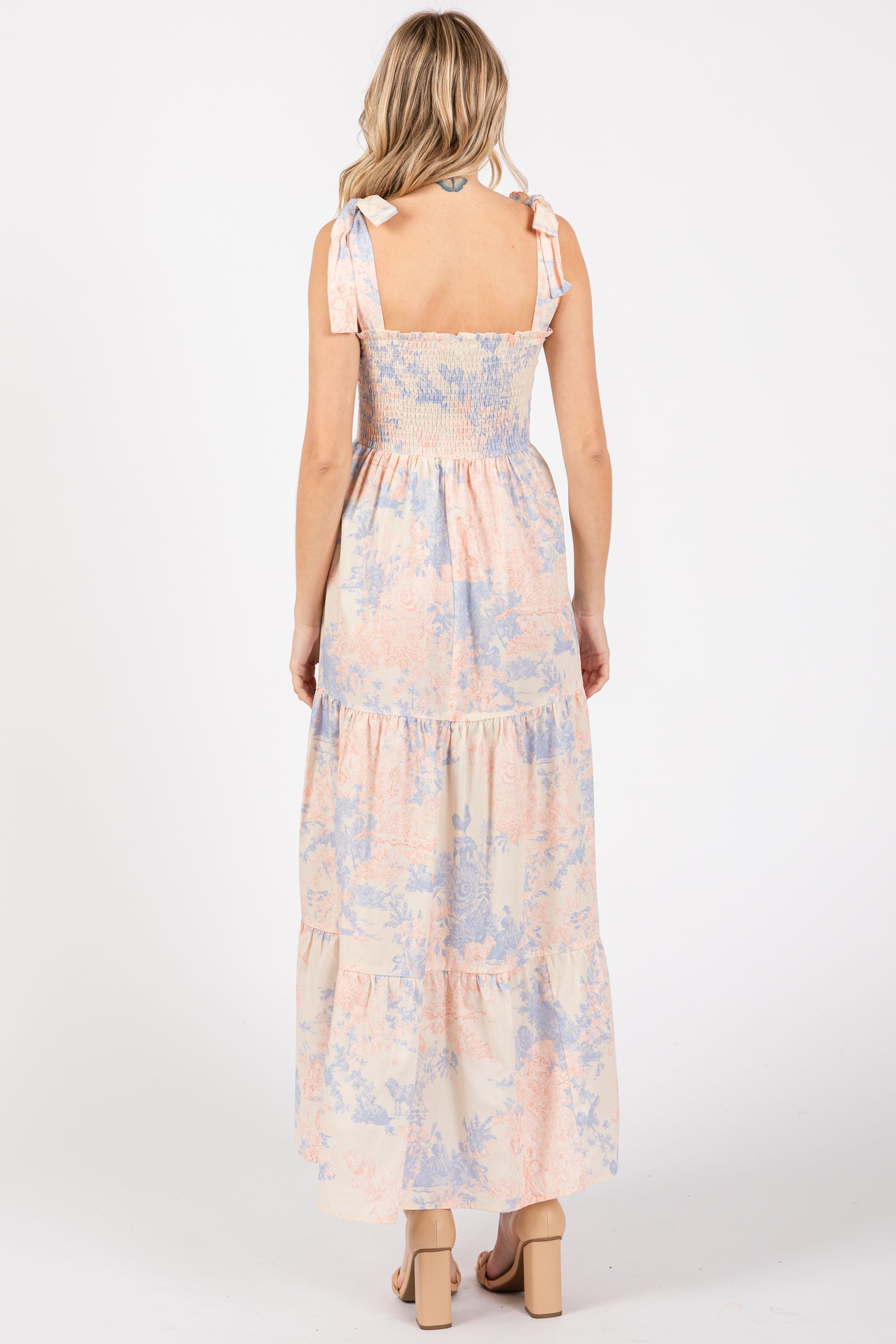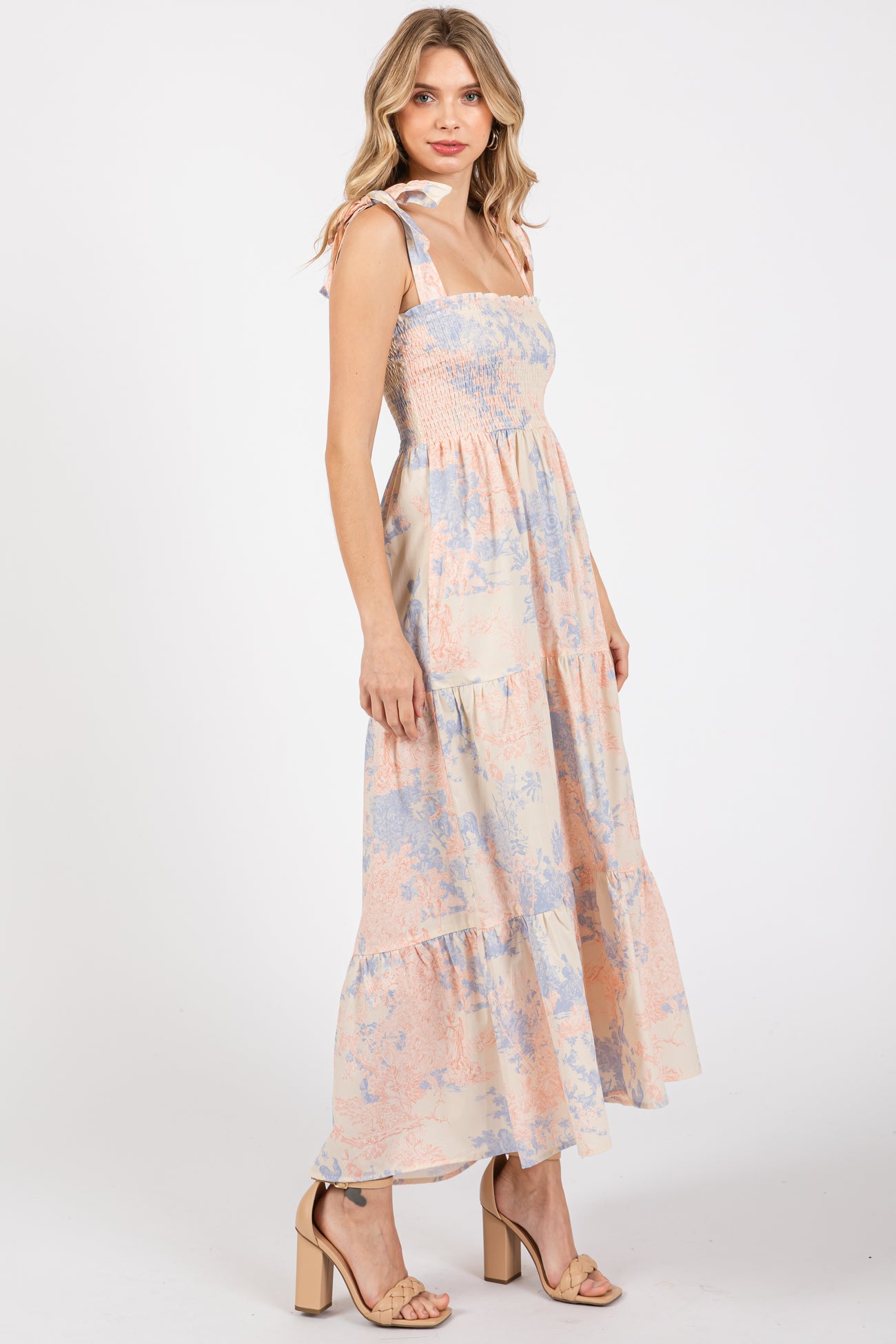 A printed midi dress featuring a smocked top, adjustable shoulder ties, side pockets, and a tiered skirt.