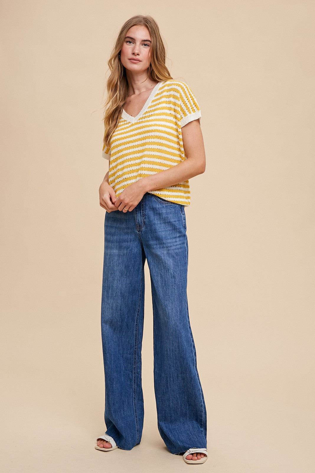 Mustard Striped Knit V-Neck Short Sleeve Top
