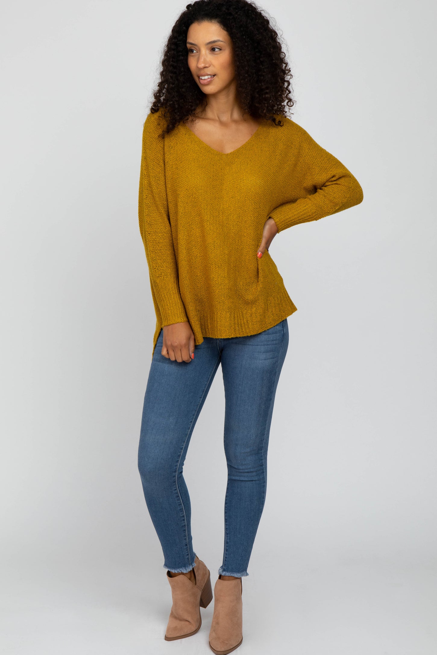 A solid sweater featuring long sleeves, a hi-low hemline with side slits and a v-neckline.