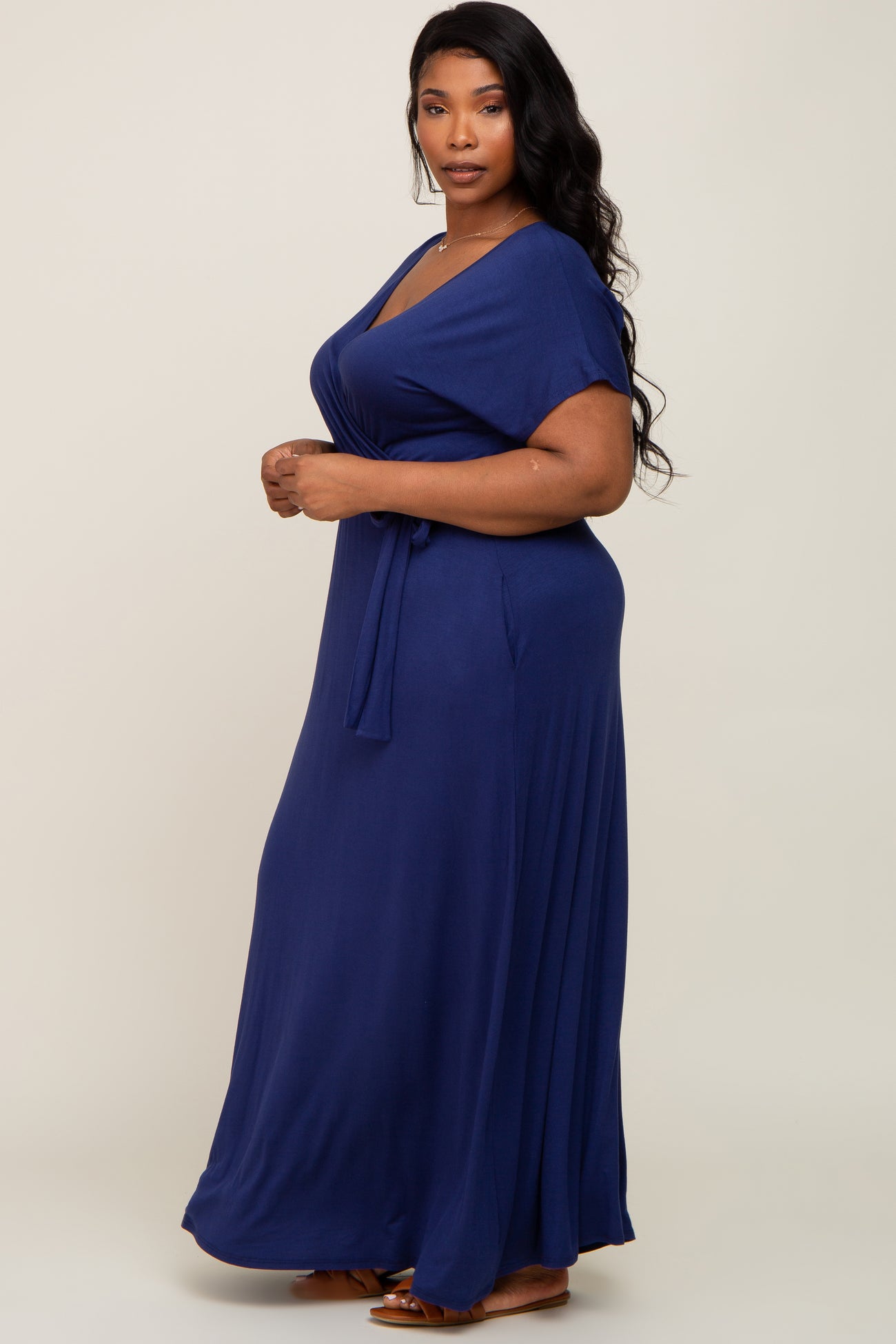 Details A solid plus maxi dress with a wrap neckline and sash tie waist. Pocketed. Content + Care