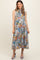 A lightweight printed maternity midi dress with a ruffle mock neck and tie detail v-neckline.