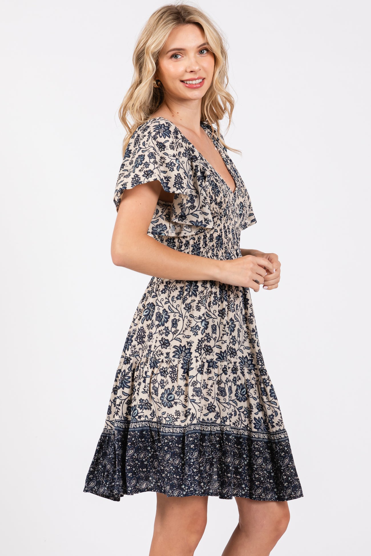 Navy Blue Floral Smocked V-Neck Tiered Dress