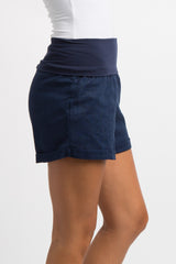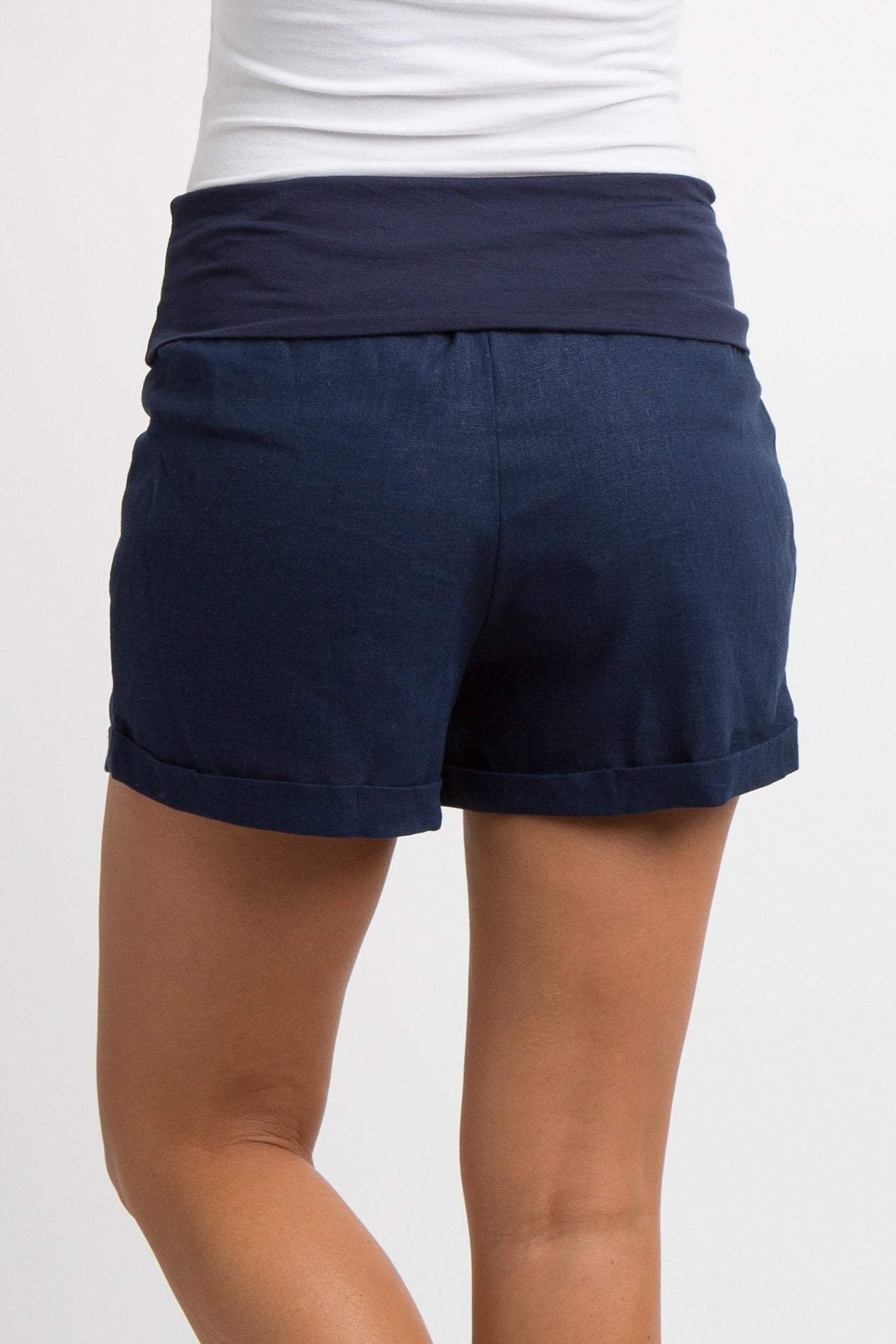 Solid linen shorts with an elastic waistband, a cuffed hem, and double lining. Material has no stretch.