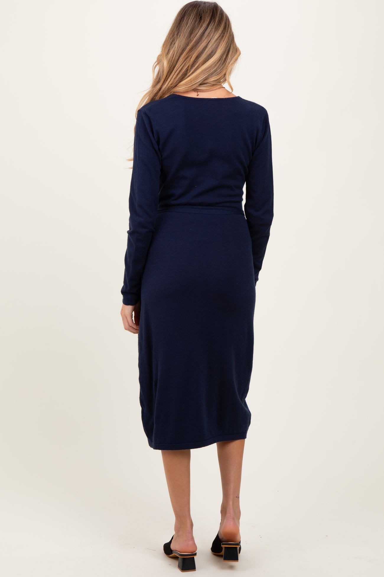 Navy Blue Knit Long Sleeve Wrap Maternity Midi Dress