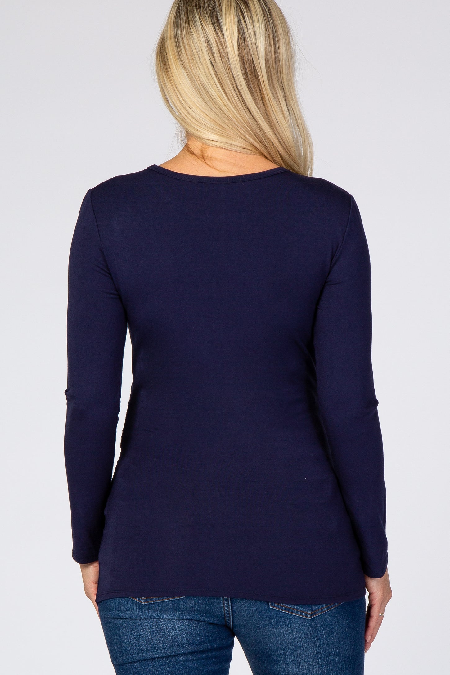 Navy Blue Long Sleeve Ruched Fitted Maternity Top