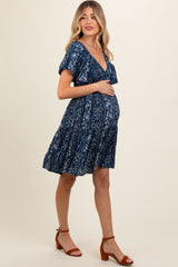Details A patterned maternity dress featuring a v-neckline, a smocked elastic top, short ruffle sleeves, an empire waist, and a tiered skirt. Content + Care